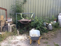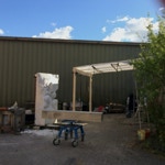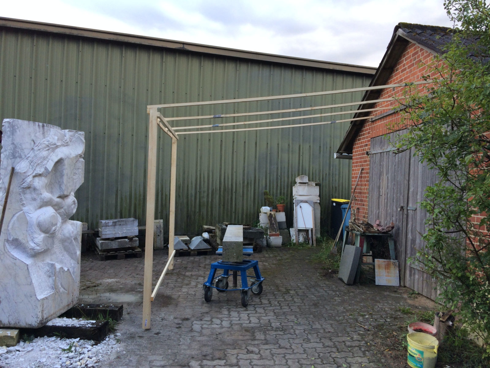 Heute beginnt die Arbeit am Projekt und der erste Tag ist profan ausgedrückt der Tag an dem der Arbeitsplatz eingerichtet wird. Altlasten müssen umstrukturiert werden. Leider ändert sich das Ambiente dabei nicht immer zum Positiven. Tatsache ist aber, der Platz sollte überdacht sein, da wir nun im September gelegentlich auch mit Regen zu rechnen haben. Da auch dann die Arbeit an der Skulptur weitergehen soll, nun dieser Umbau.
