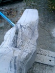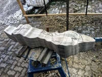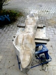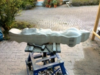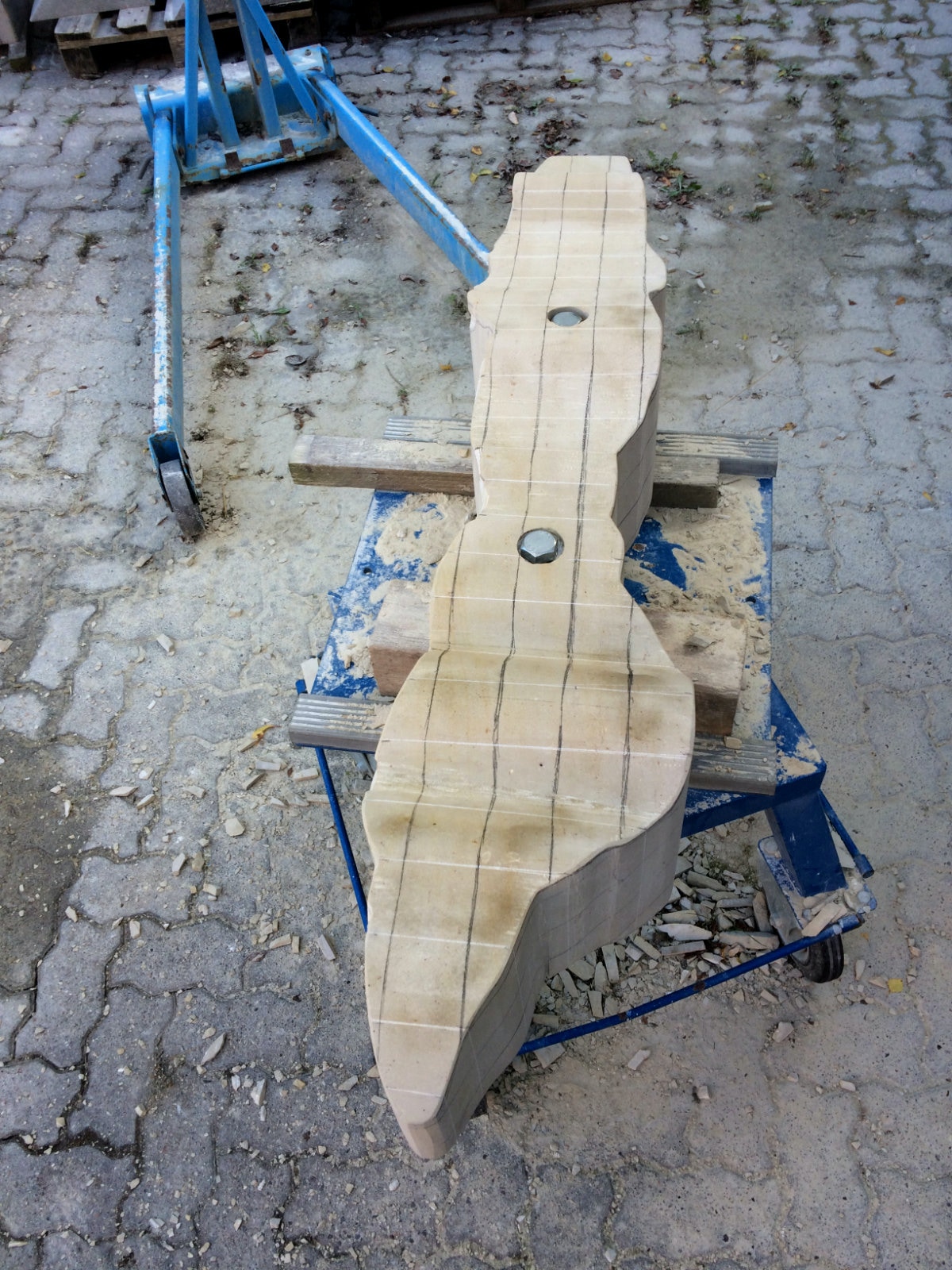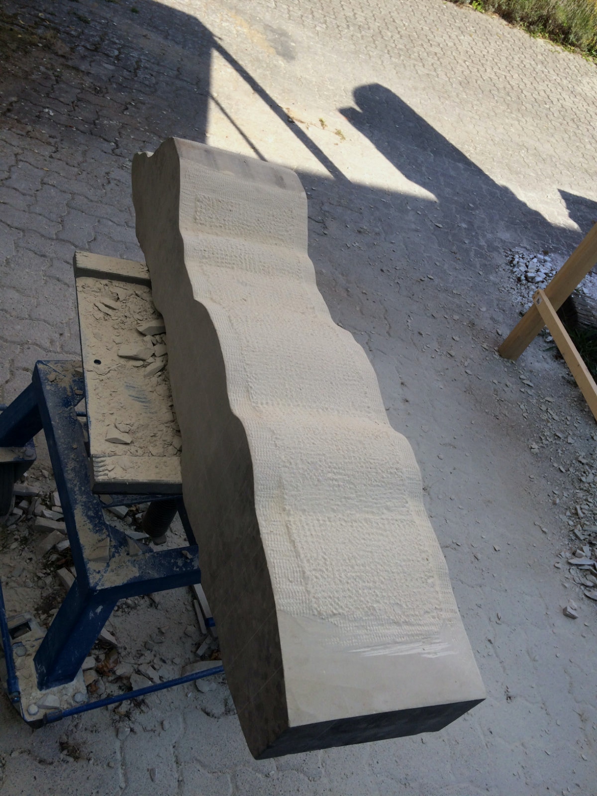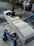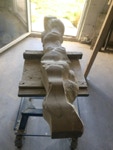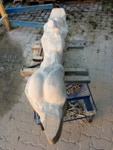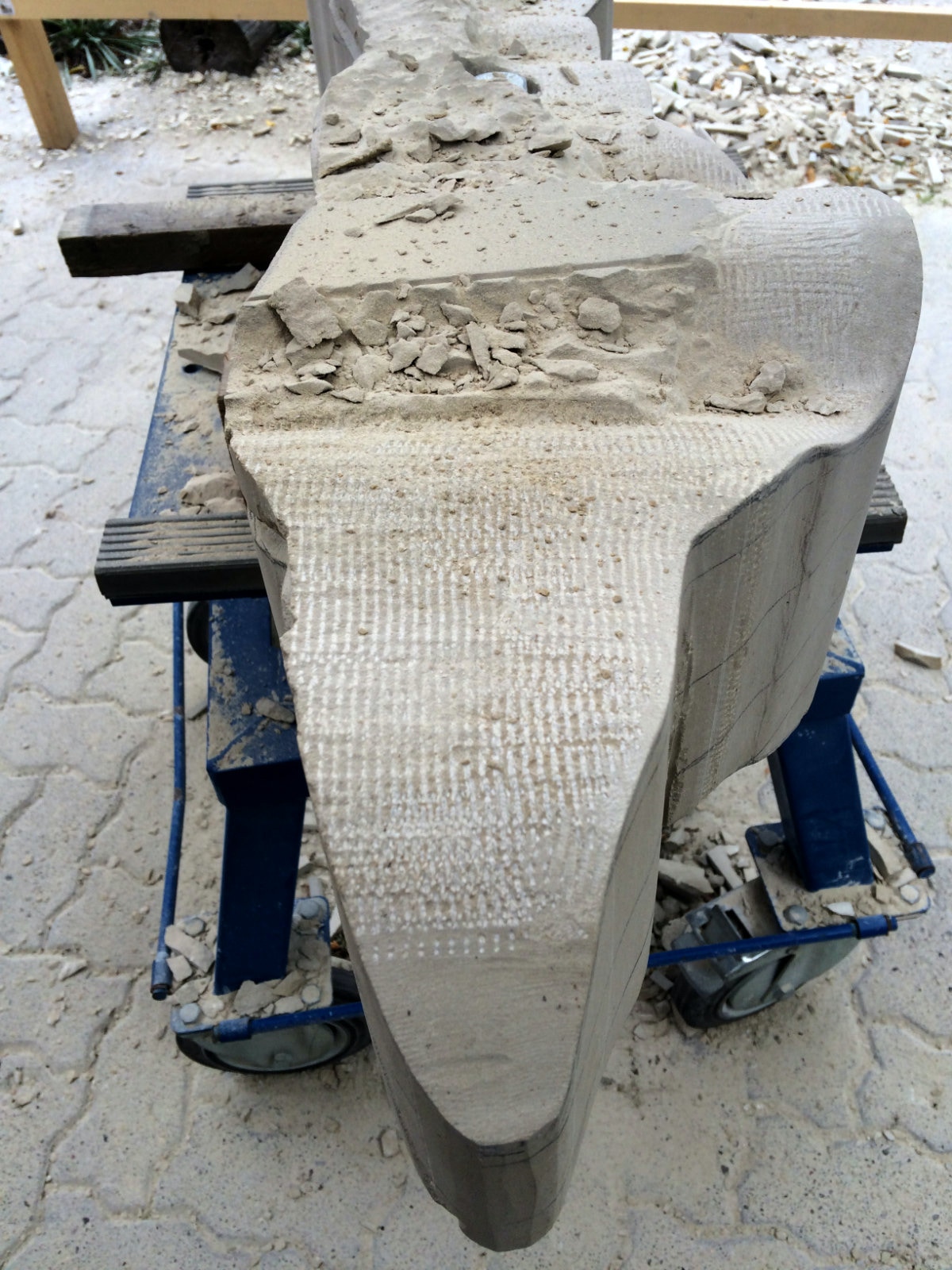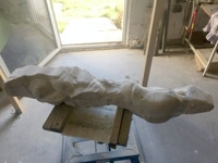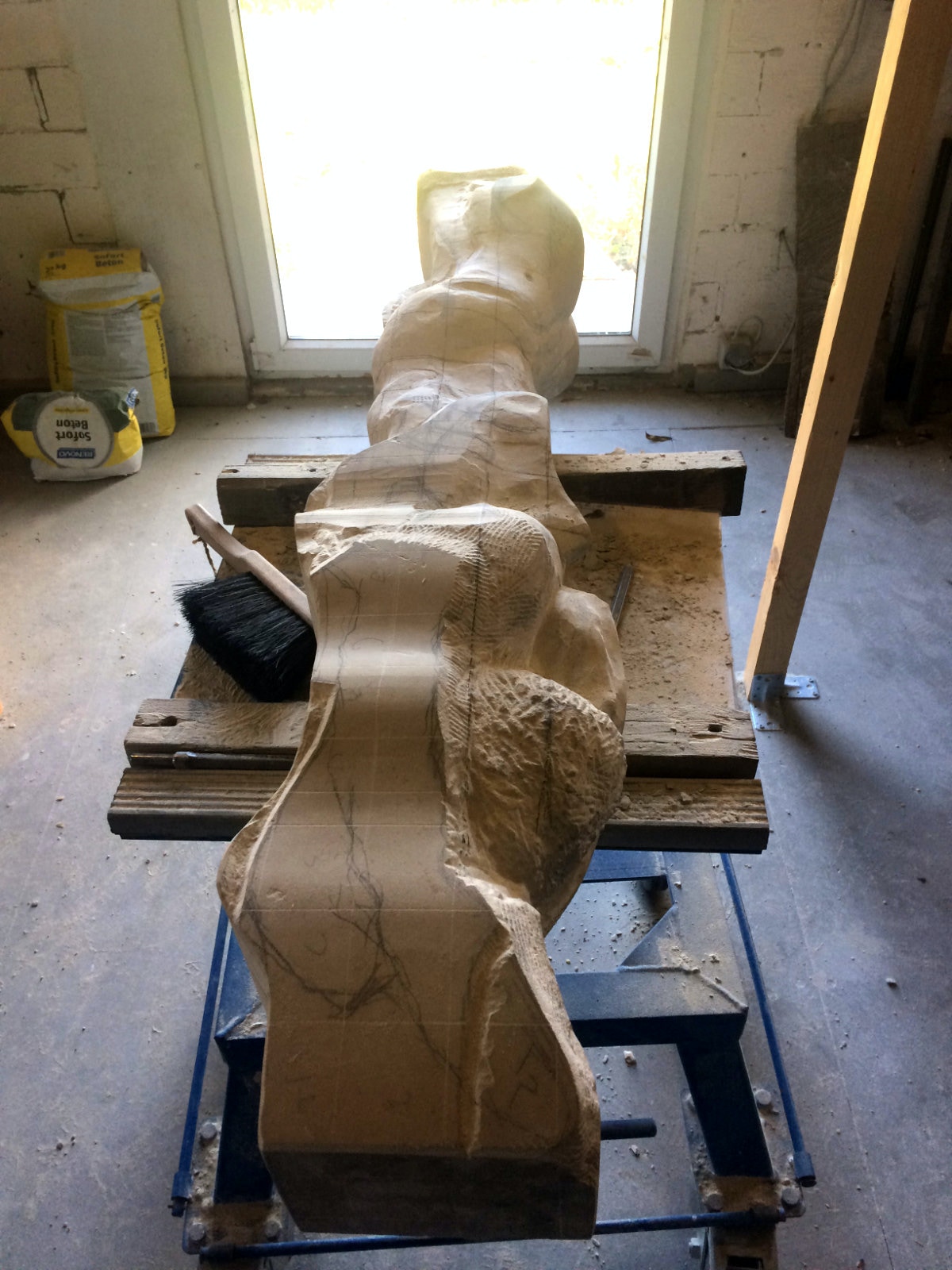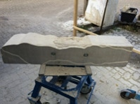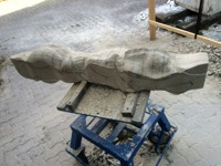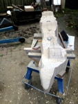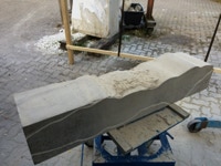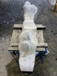 Dem Model entsprechend wird die Figur später auf zwei Rohren stehen um ein gewisses Maß an optischer Leichtigkeit zu gewährleisten. Das Ausgangsgewicht des Steins in seiner ursprünglichen Form betrug: 184 x 24 x 24 cm x 2,26 T = 240 Kg. Nun als getrennte Einheit: 120 x 24 x 24 cm x 2,26 T = 156 Kg.