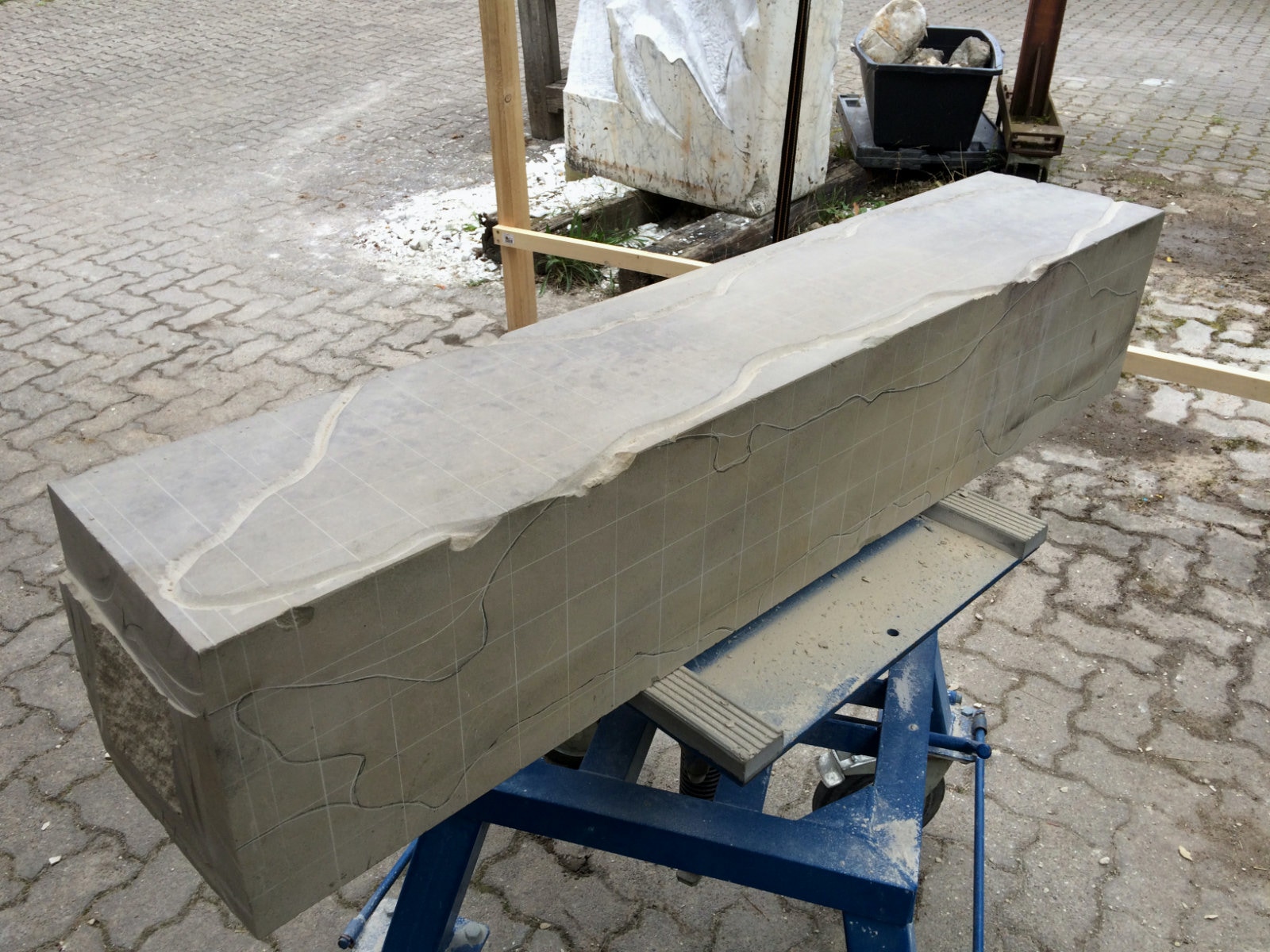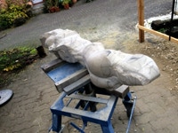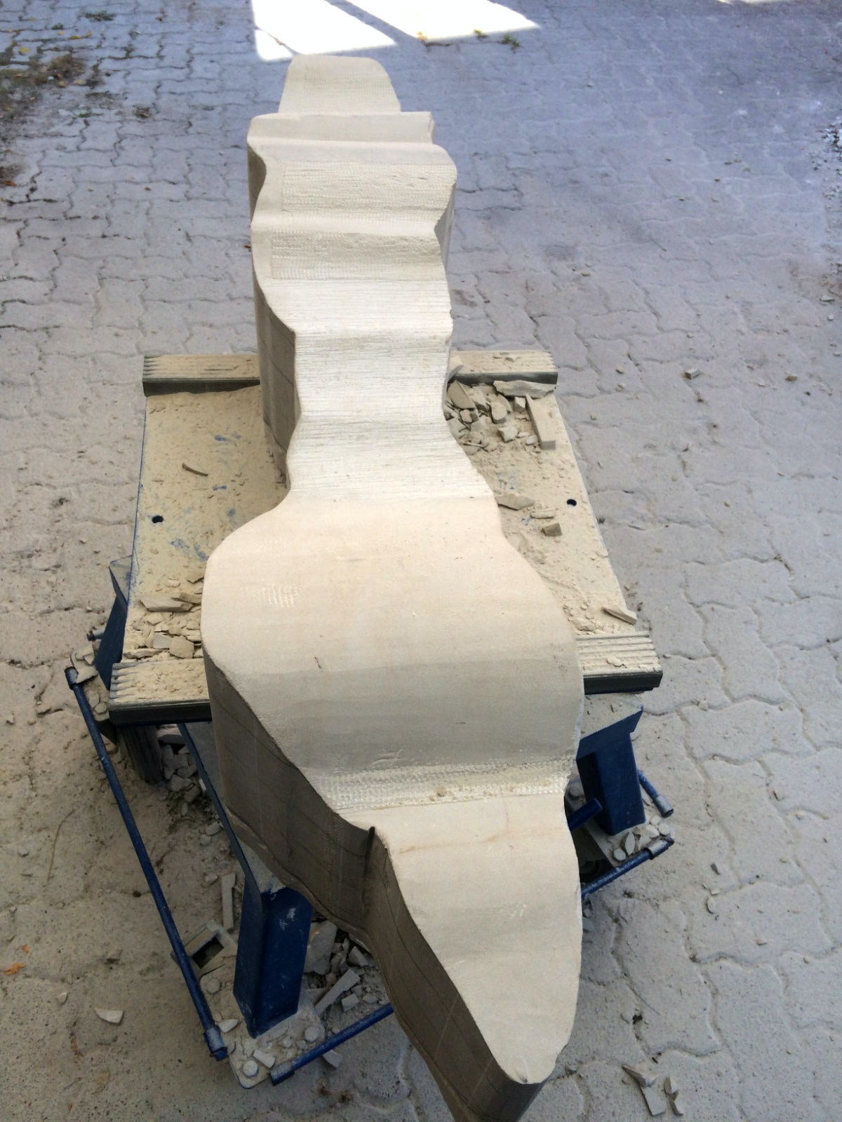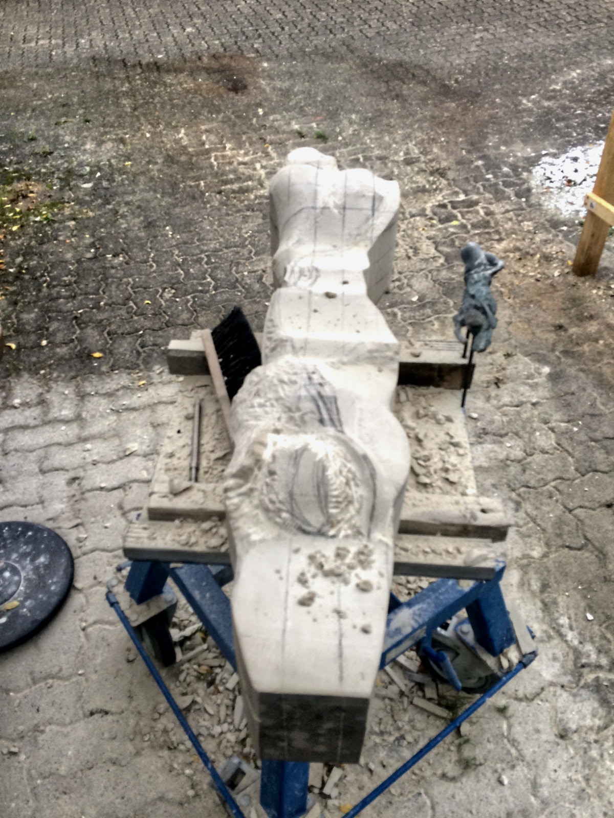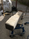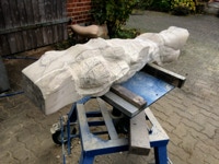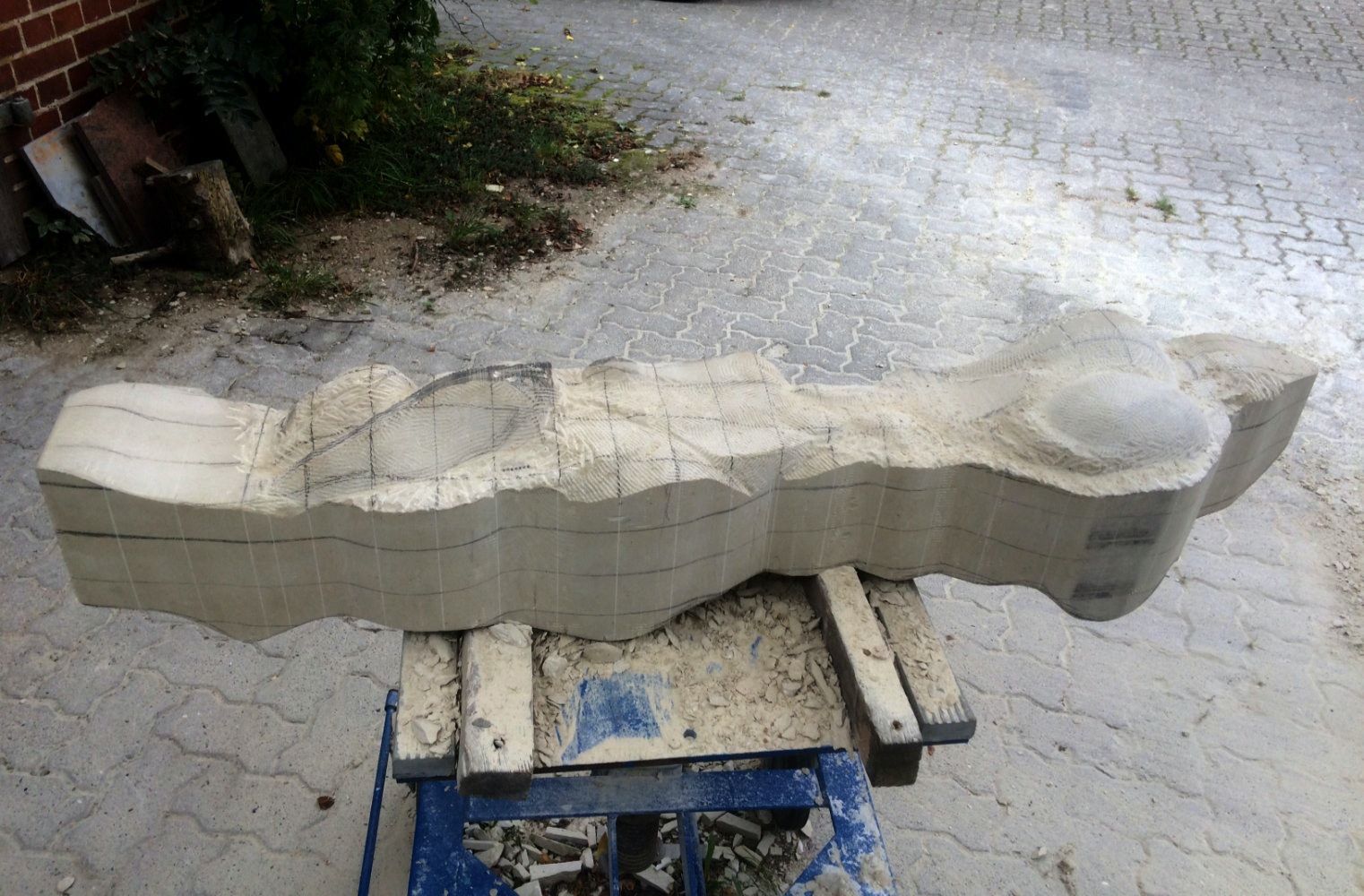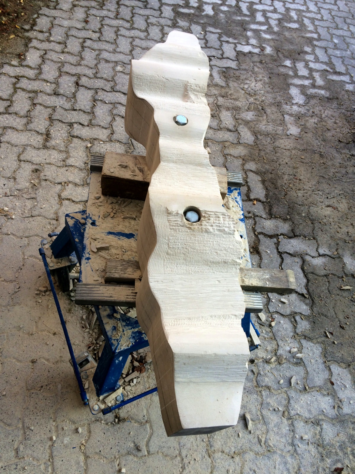 Dem Model entsprechend wird die Figur später auf zwei Rohren stehen um ein gewisses Maß an optischer Leichtigkeit zu gewährleisten. Das Ausgangsgewicht des Steins in seiner ursprünglichen Form betrug: 184 x 24 x 24 cm x 2,26 T = 240 Kg. Nun als getrennte Einheit: 120 x 24 x 24 cm x 2,26 T = 156 Kg.
