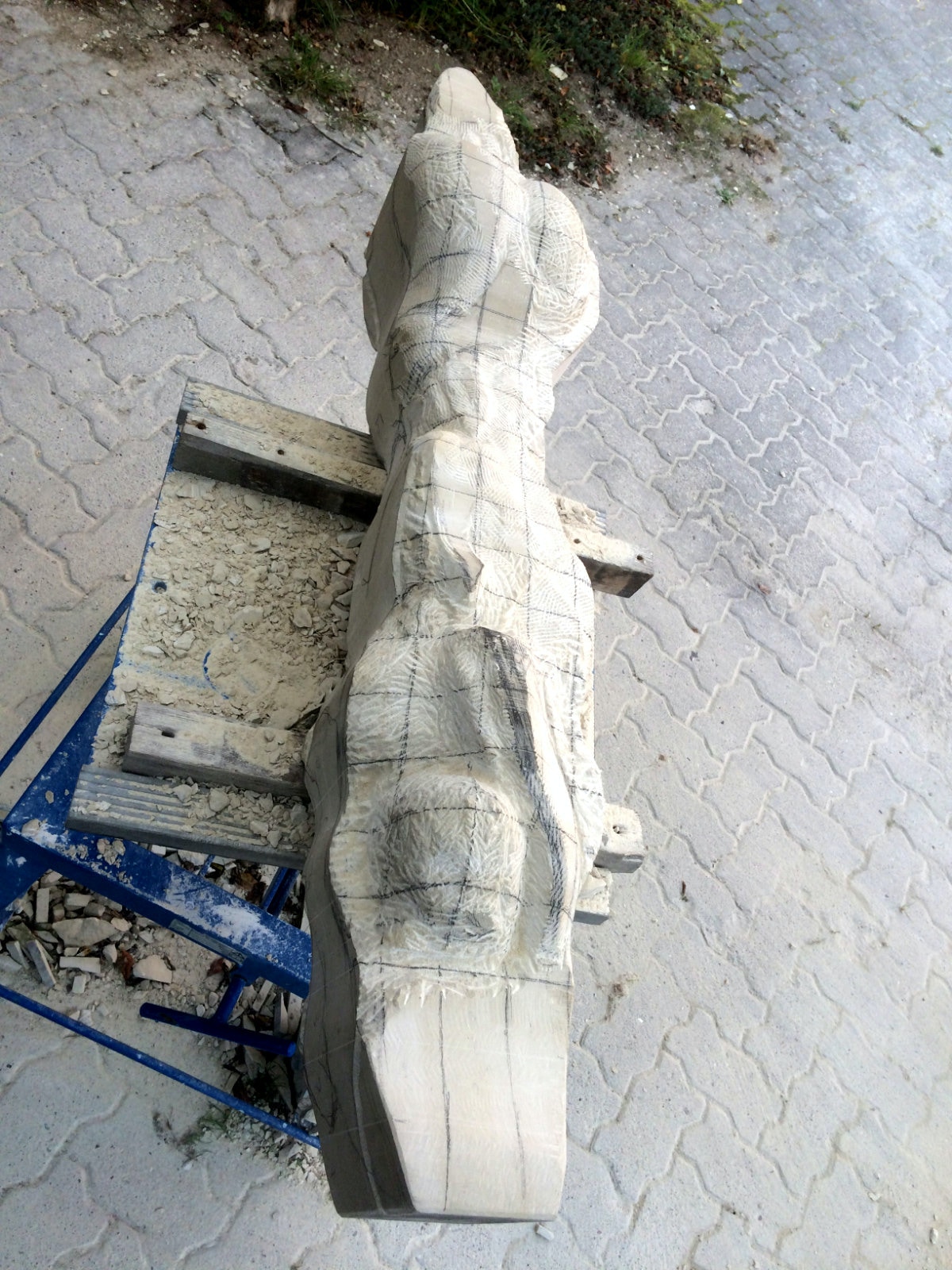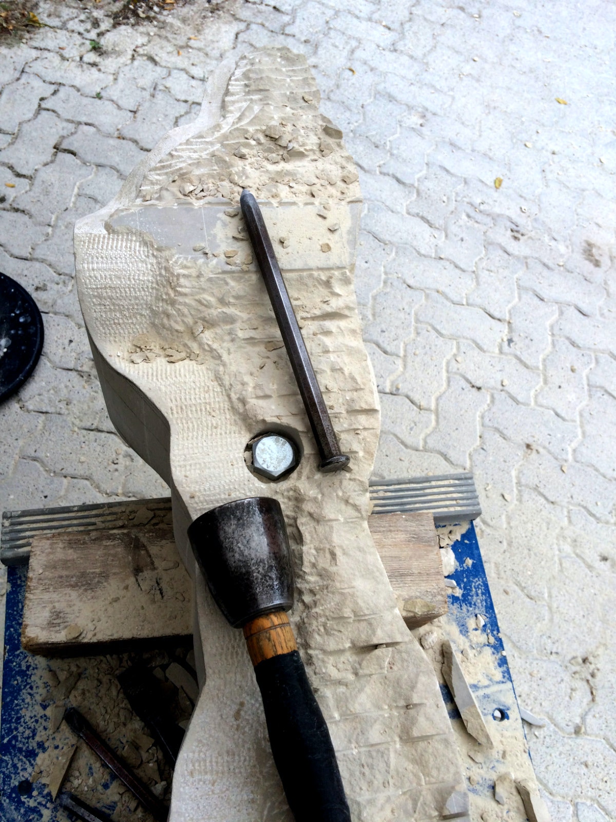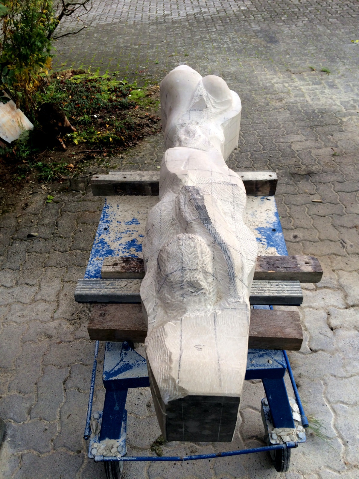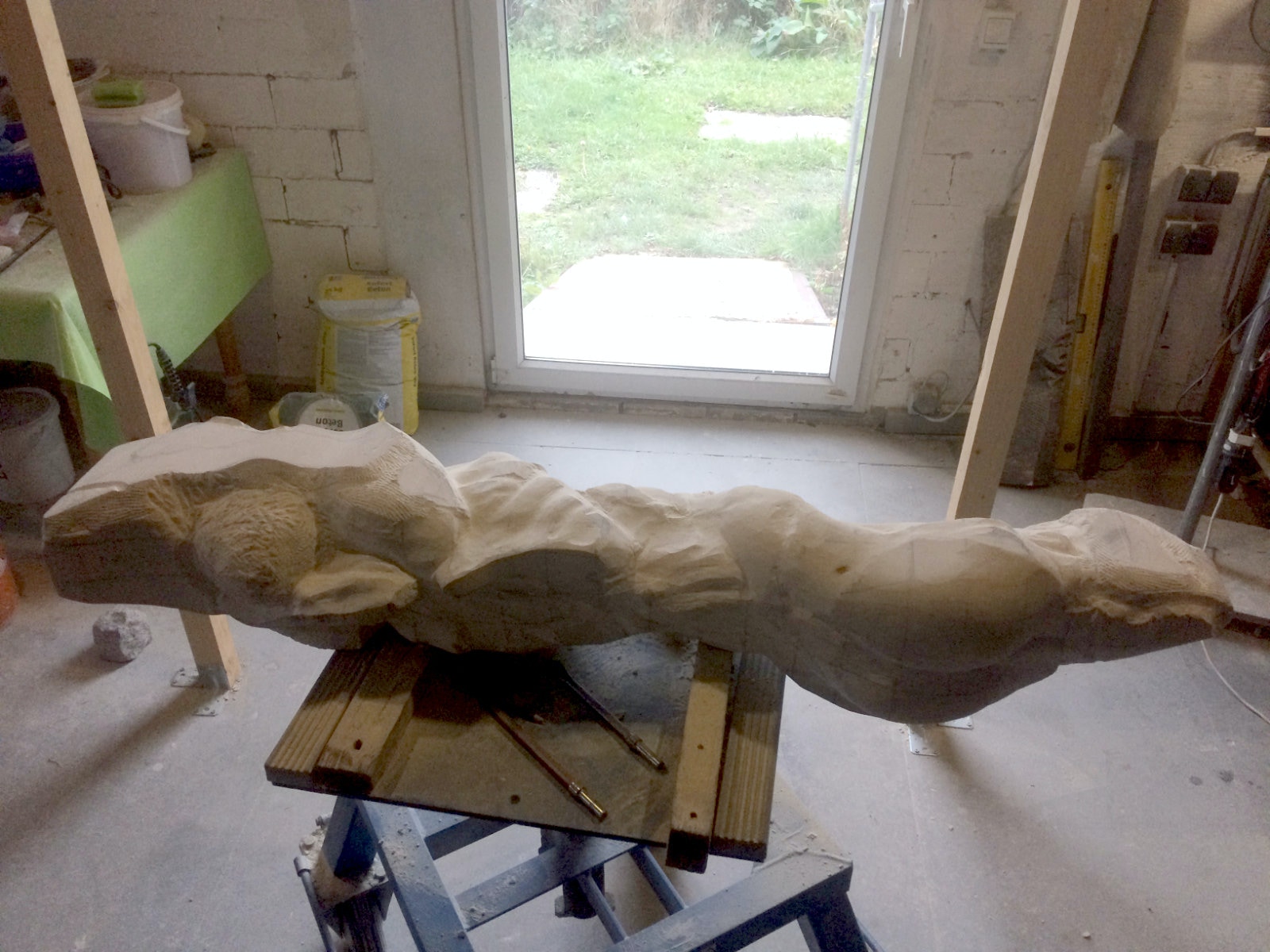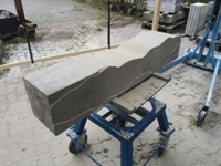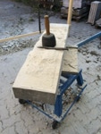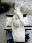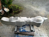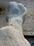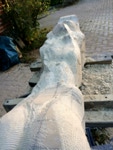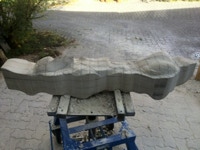 Dem Model entsprechend wird die Figur später auf zwei Rohren stehen um ein gewisses Maß an optischer Leichtigkeit zu gewährleisten. Das Ausgangsgewicht des Steins in seiner ursprünglichen Form betrug: 184 x 24 x 24 cm x 2,26 T = 240 Kg. Nun als getrennte Einheit: 120 x 24 x 24 cm x 2,26 T = 156 Kg.