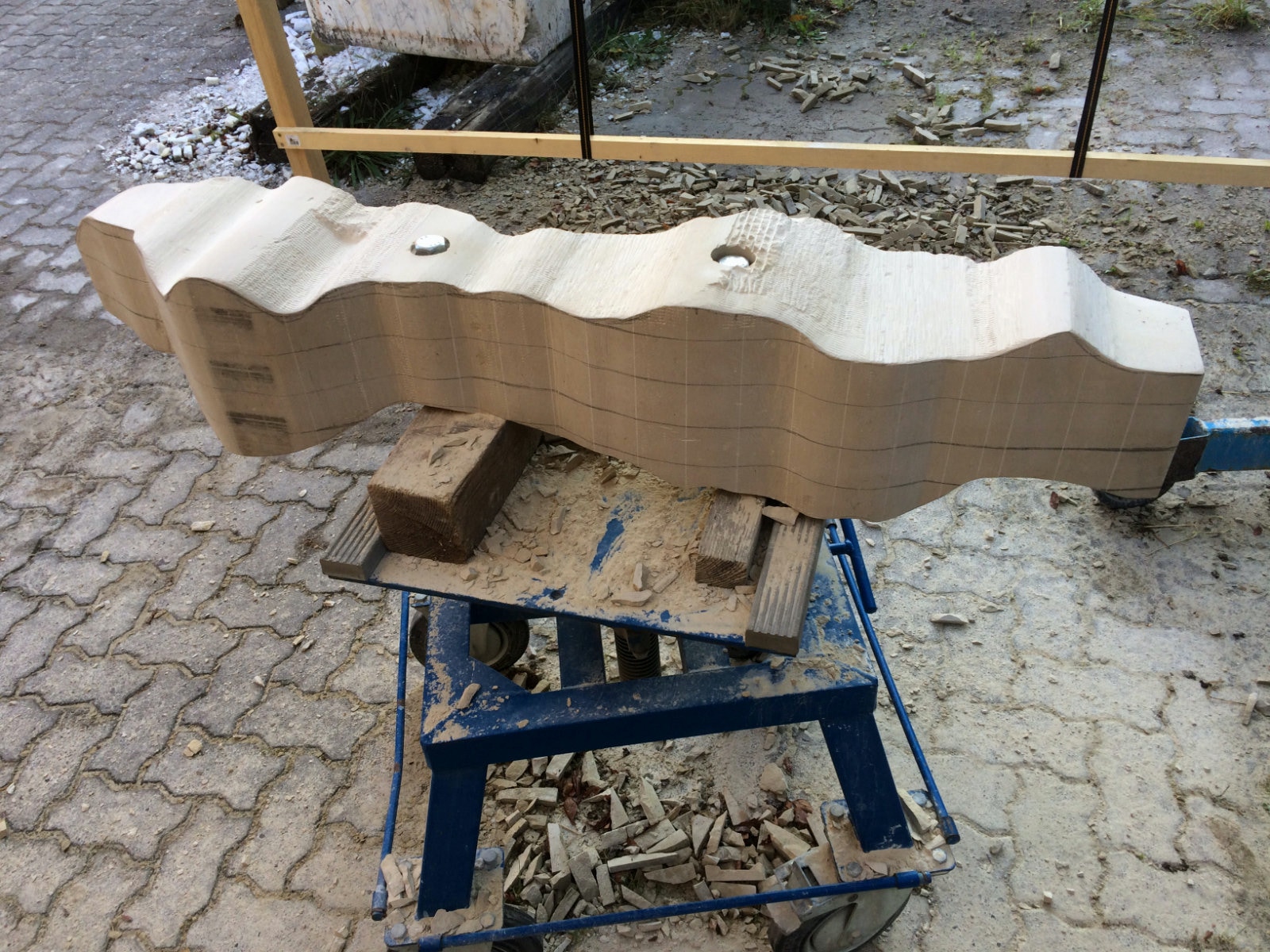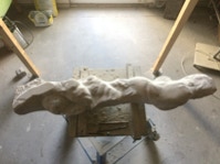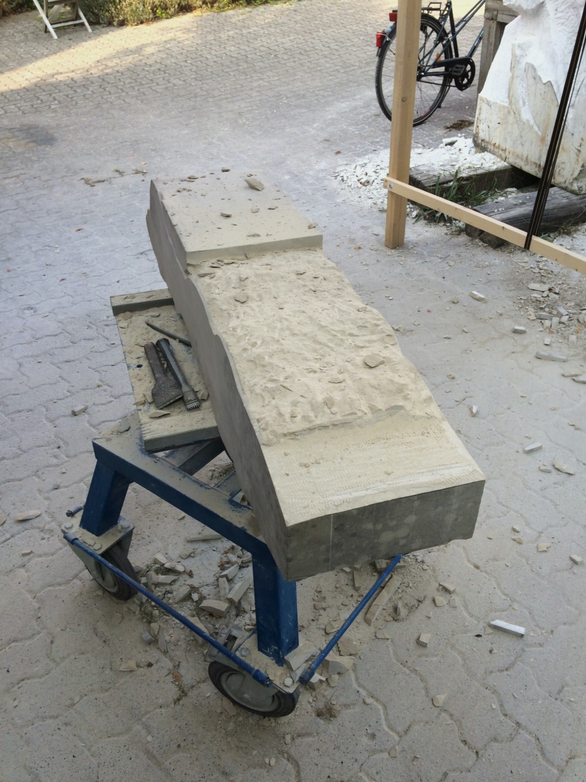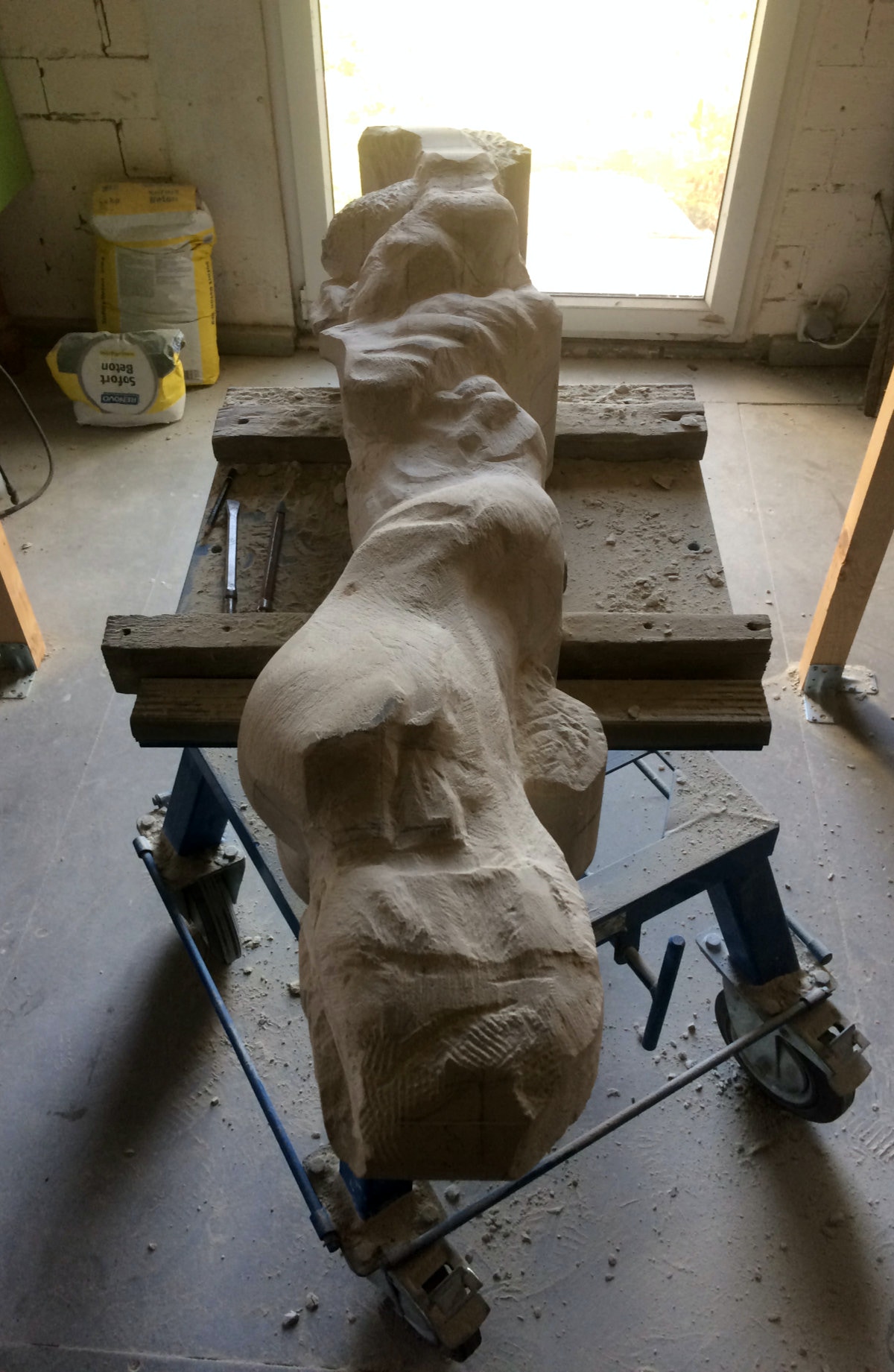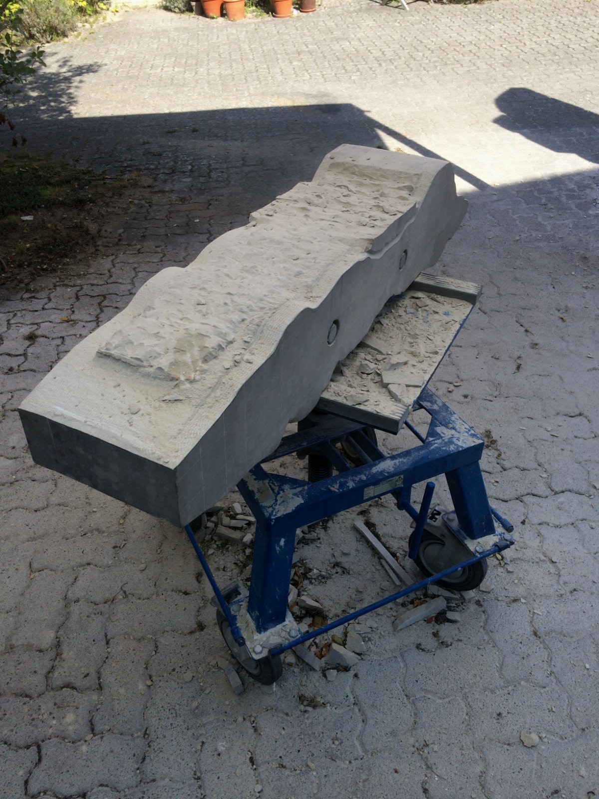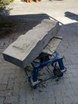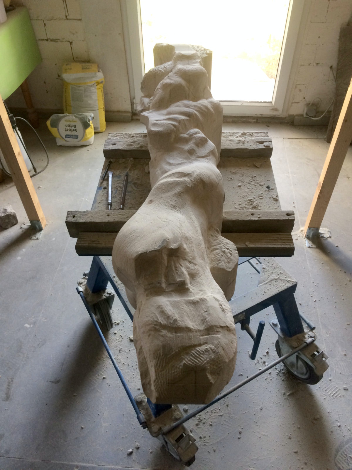Dem Model entsprechend wird die Figur später auf zwei Rohren stehen um ein gewisses Maß an optischer Leichtigkeit zu gewährleisten. Das Ausgangsgewicht des Steins in seiner ursprünglichen Form betrug: 184 x 24 x 24 cm x 2,26 T = 240 Kg. Nun als getrennte Einheit: 120 x 24 x 24 cm x 2,26 T = 156 Kg.