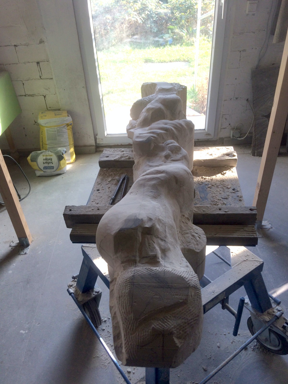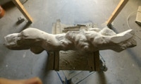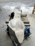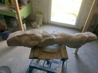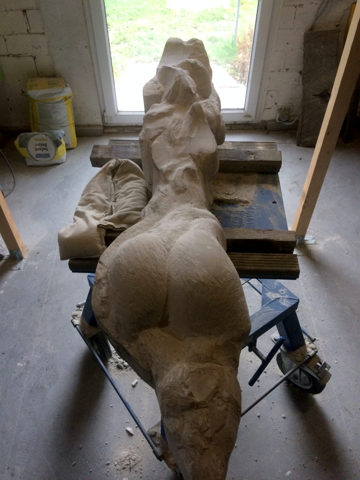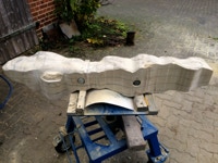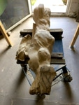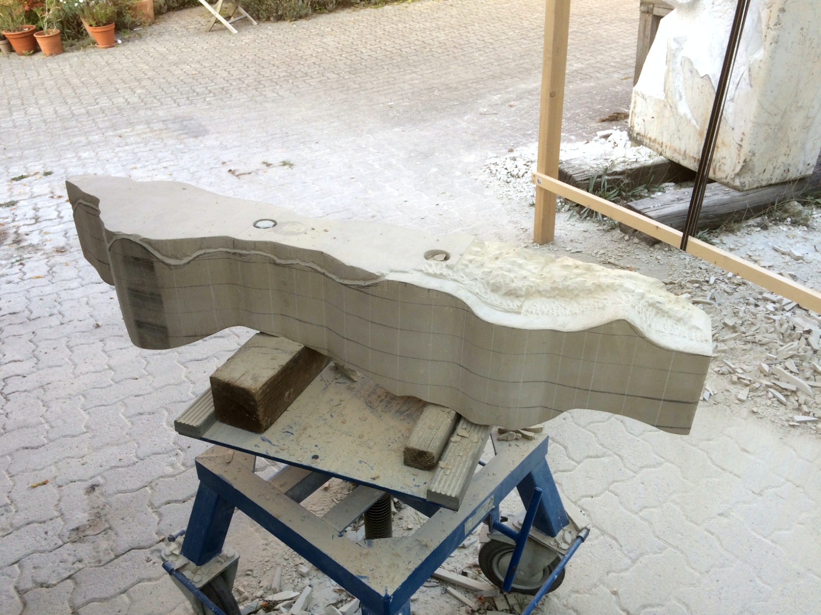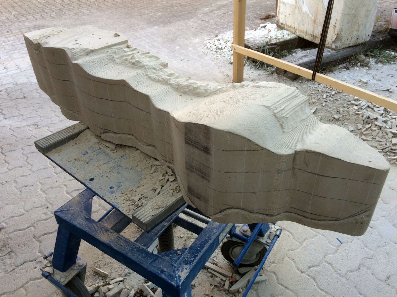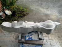 Dem Model entsprechend wird die Figur später auf zwei Rohren stehen um ein gewisses Maß an optischer Leichtigkeit zu gewährleisten. Das Ausgangsgewicht des Steins in seiner ursprünglichen Form betrug: 184 x 24 x 24 cm x 2,26 T = 240 Kg. Nun als getrennte Einheit: 120 x 24 x 24 cm x 2,26 T = 156 Kg.