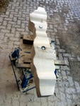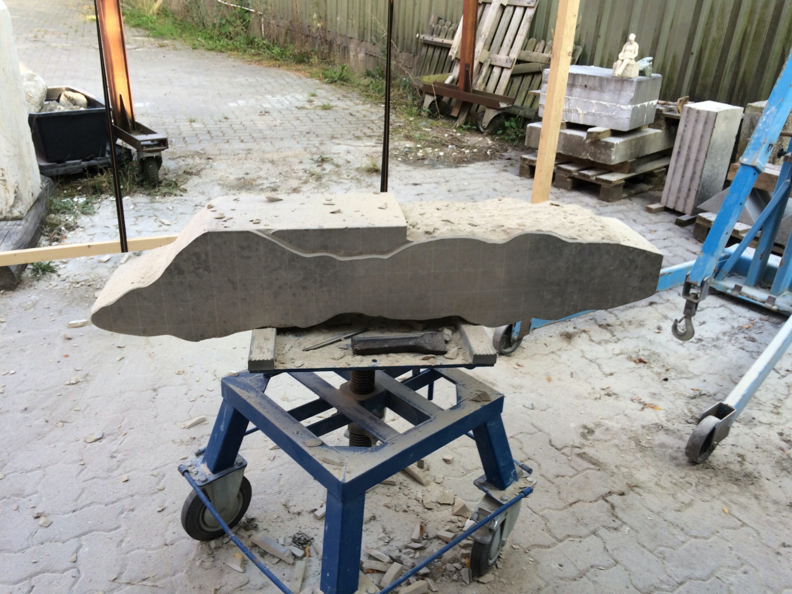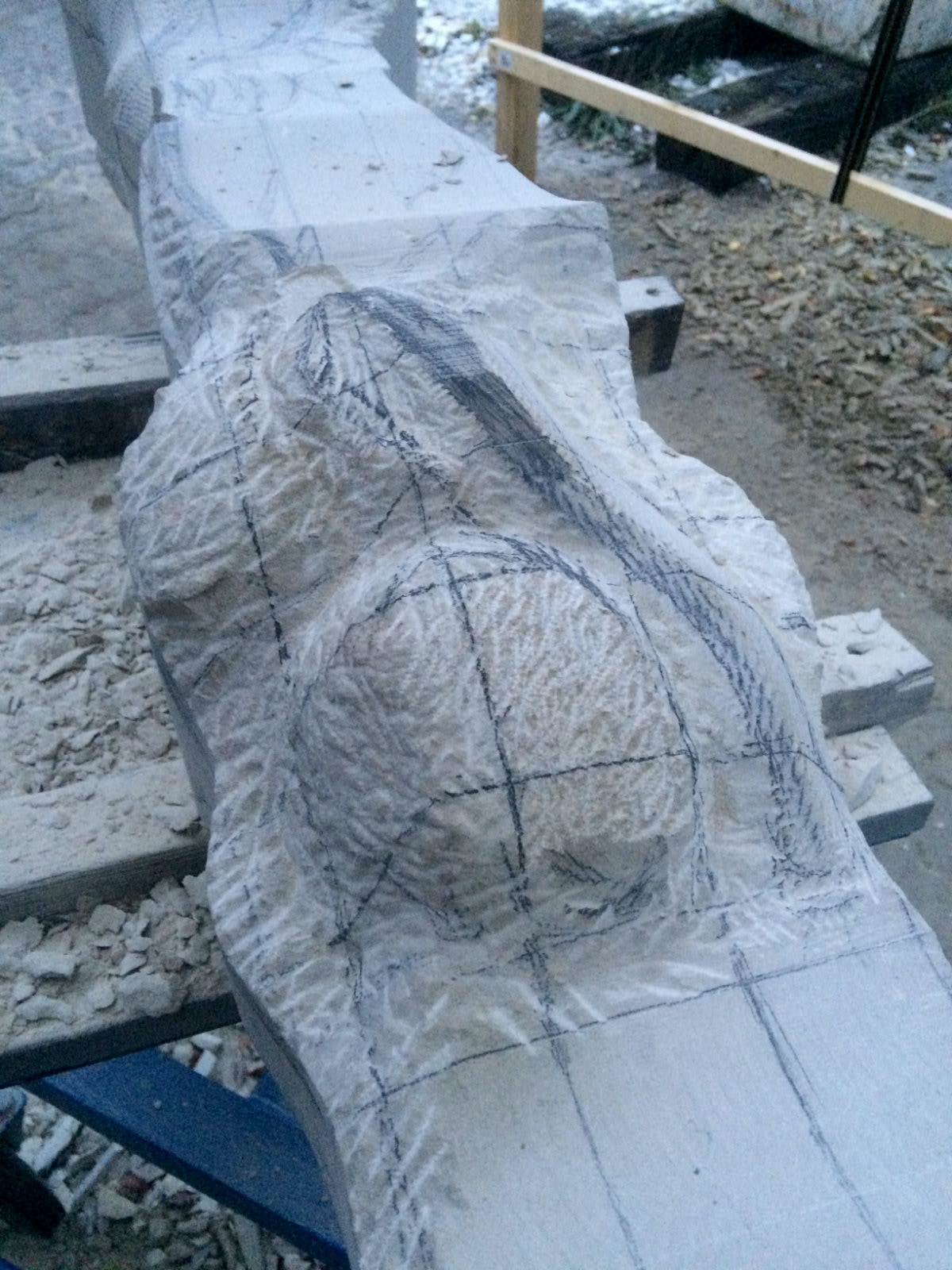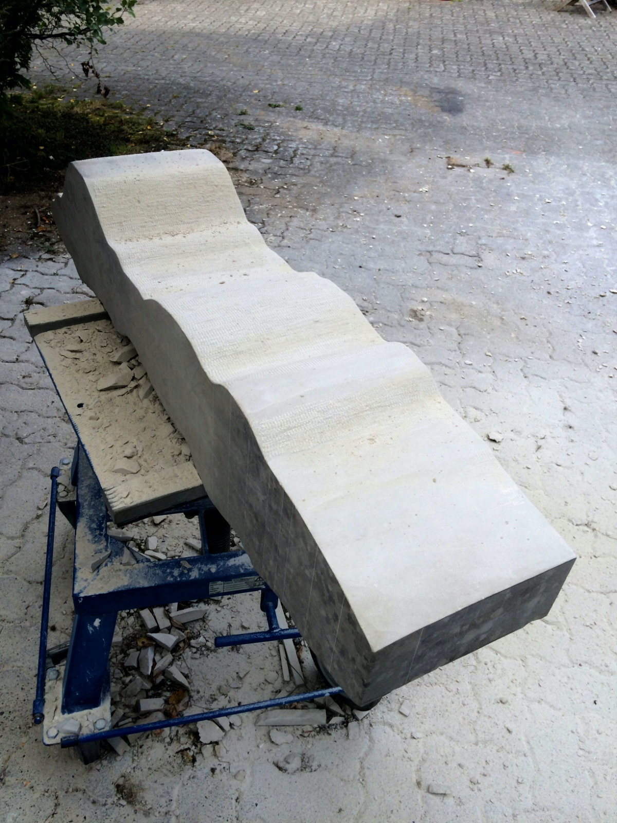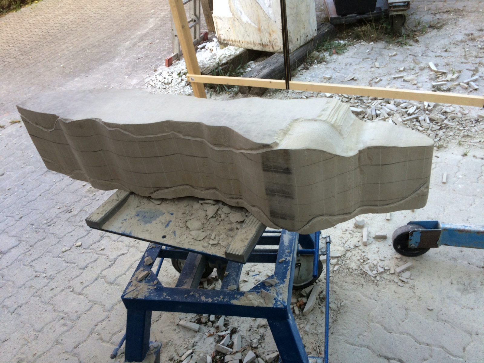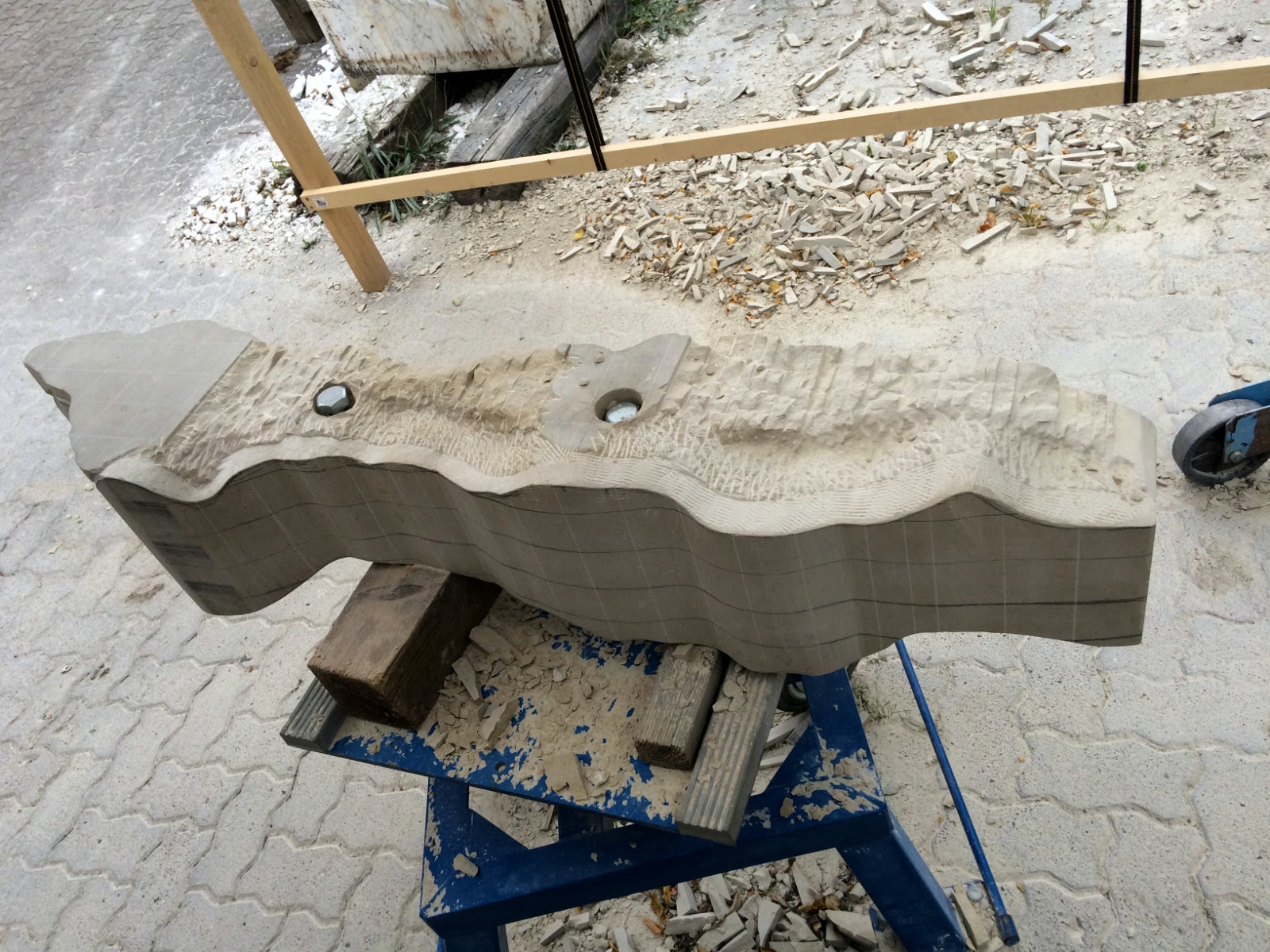 Dem Model entsprechend wird die Figur später auf zwei Rohren stehen um ein gewisses Maß an optischer Leichtigkeit zu gewährleisten. Das Ausgangsgewicht des Steins in seiner ursprünglichen Form betrug: 184 x 24 x 24 cm x 2,26 T = 240 Kg. Nun als getrennte Einheit: 120 x 24 x 24 cm x 2,26 T = 156 Kg.