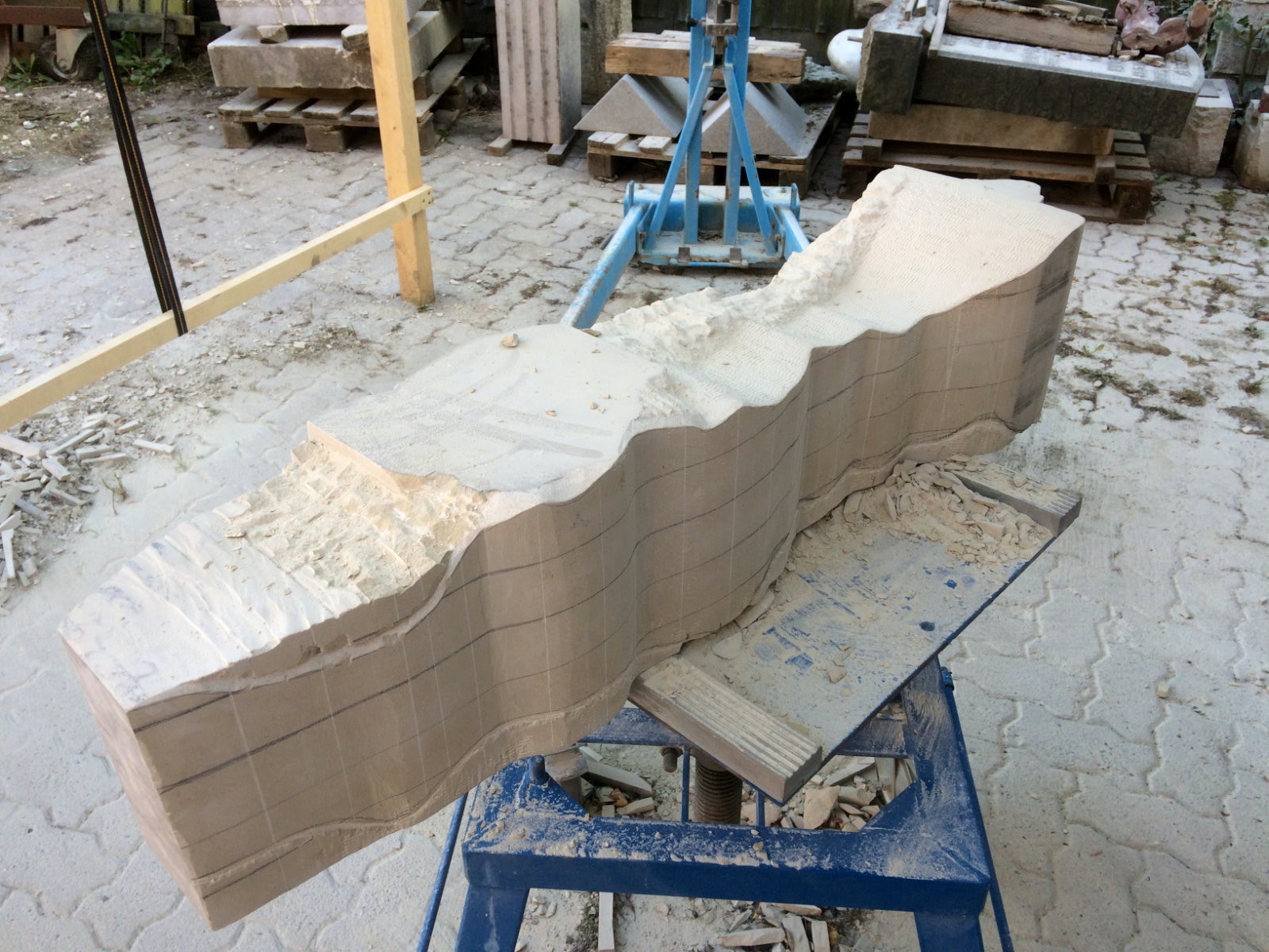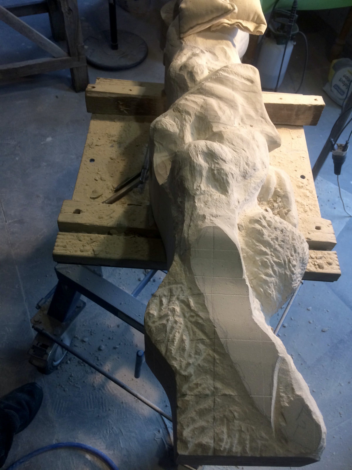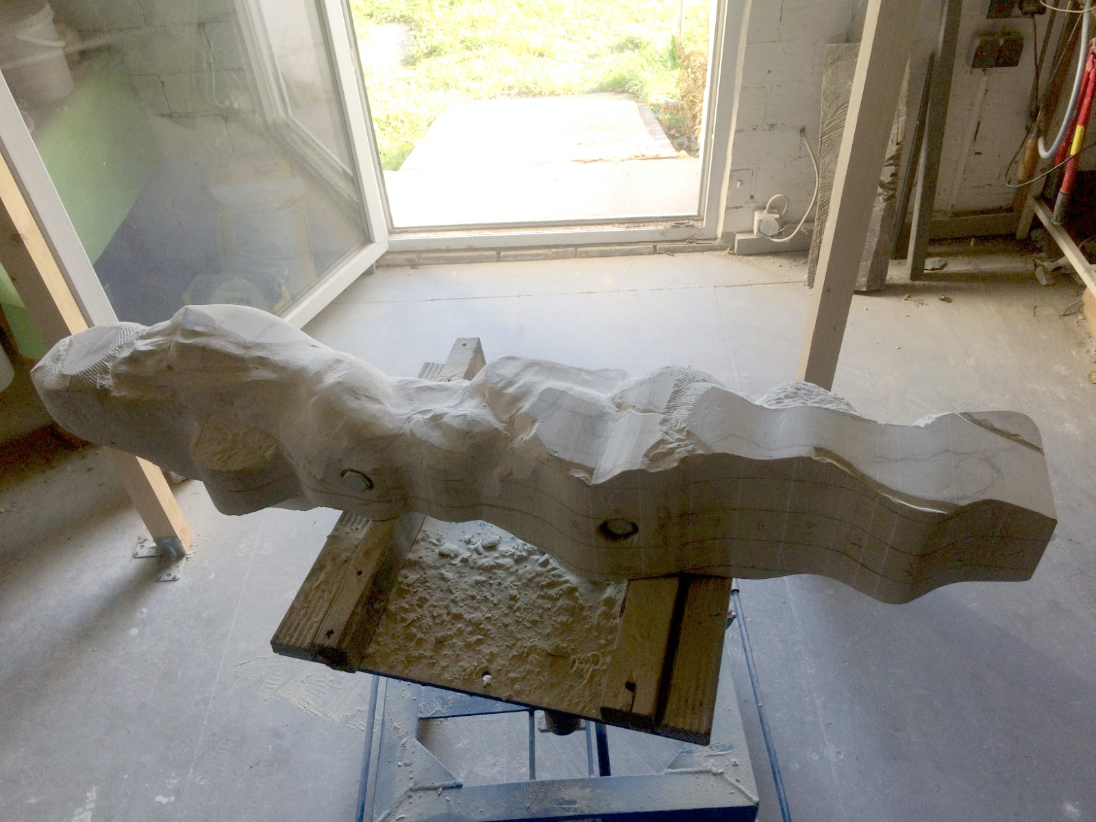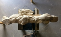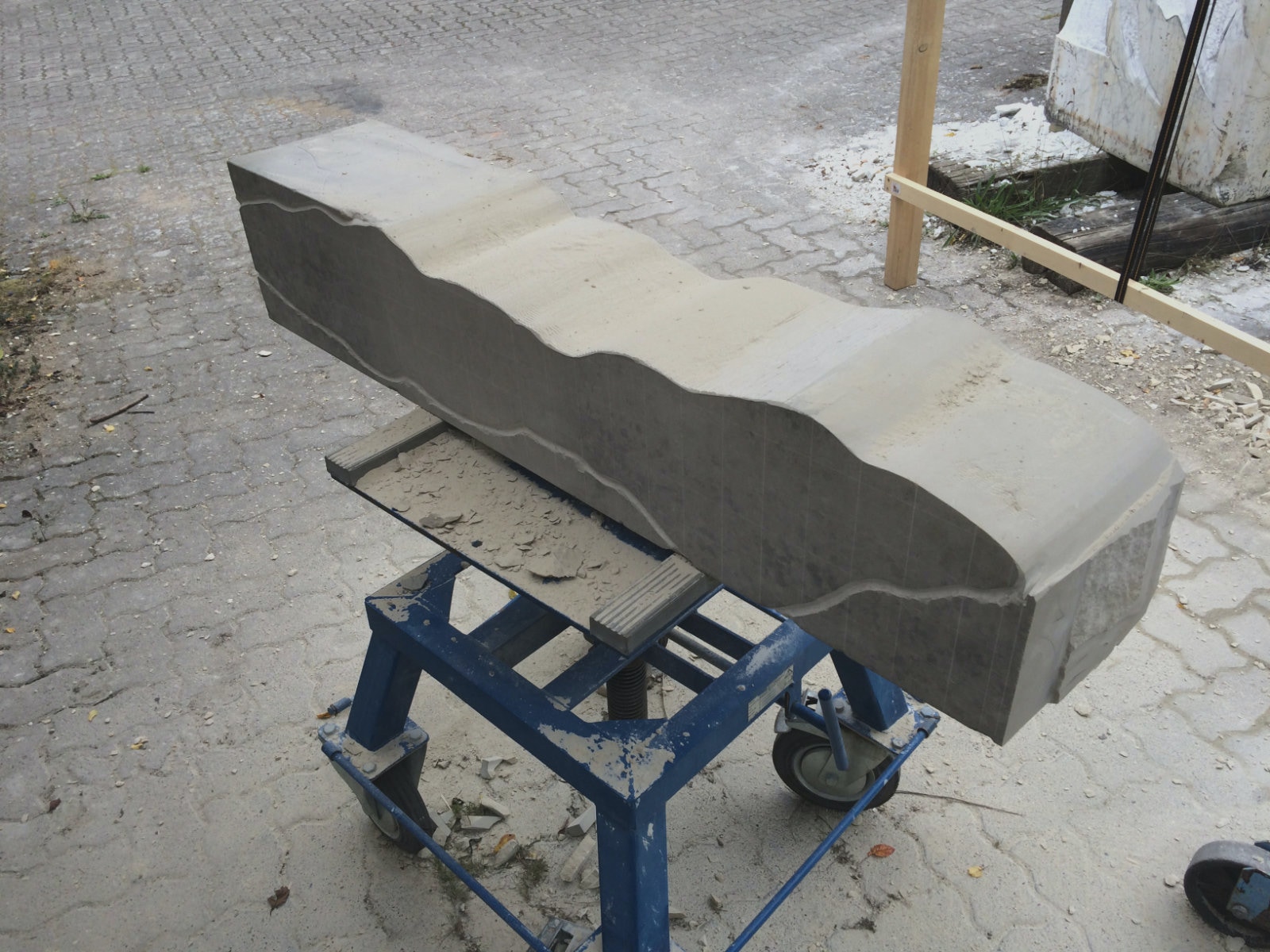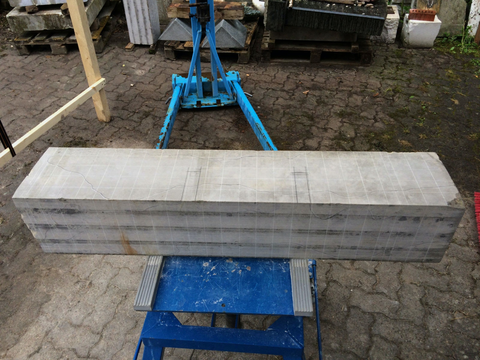 Dem Model entsprechend wird die Figur später auf zwei Rohren stehen um ein gewisses Maß an optischer Leichtigkeit zu gewährleisten. Das Ausgangsgewicht des Steins in seiner ursprünglichen Form betrug: 184 x 24 x 24 cm x 2,26 T = 240 Kg. Nun als getrennte Einheit: 120 x 24 x 24 cm x 2,26 T = 156 Kg.