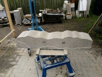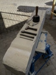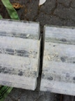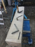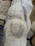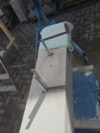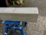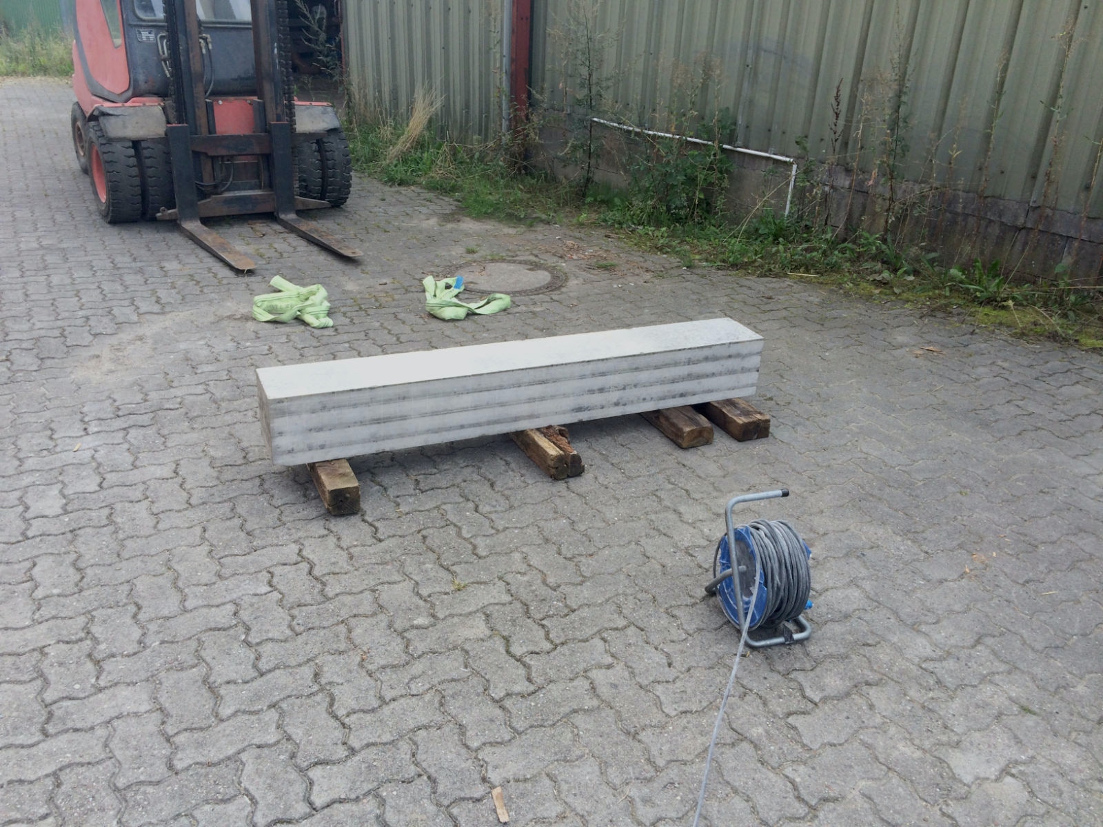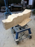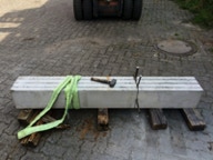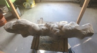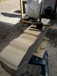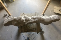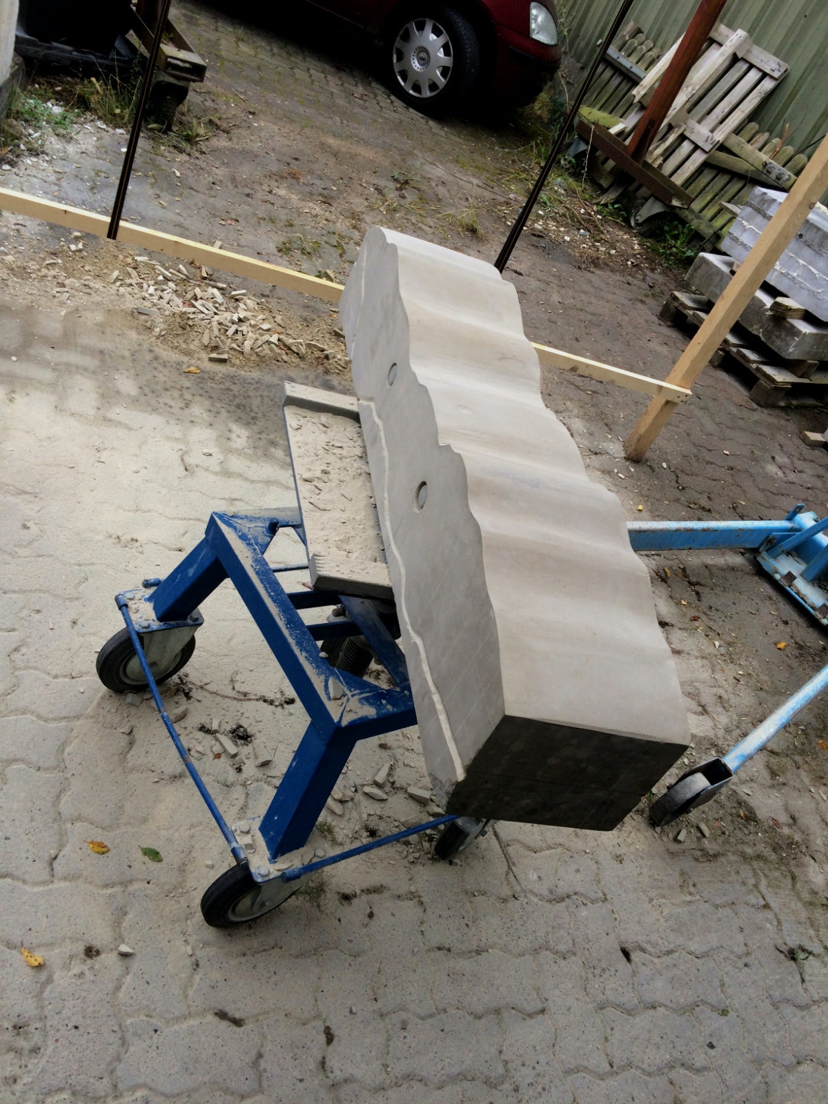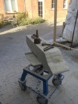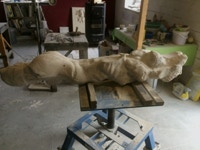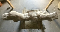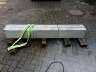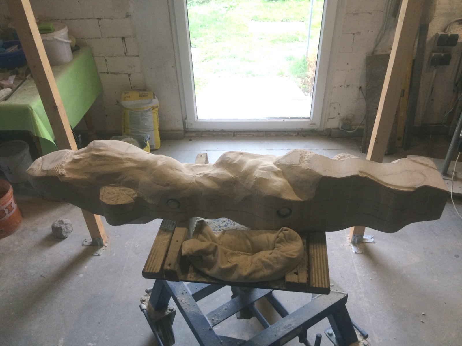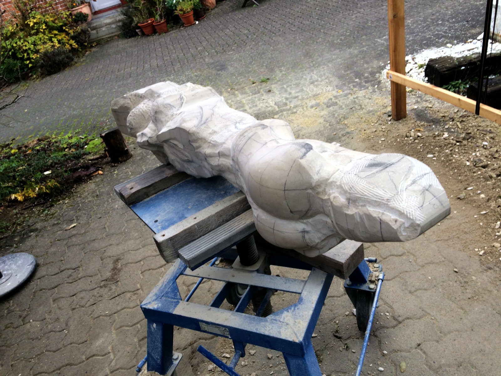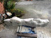 Dem Model entsprechend wird die Figur später auf zwei Rohren stehen um ein gewisses Maß an optischer Leichtigkeit zu gewährleisten. Das Ausgangsgewicht des Steins in seiner ursprünglichen Form betrug: 184 x 24 x 24 cm x 2,26 T = 240 Kg. Nun als getrennte Einheit: 120 x 24 x 24 cm x 2,26 T = 156 Kg.