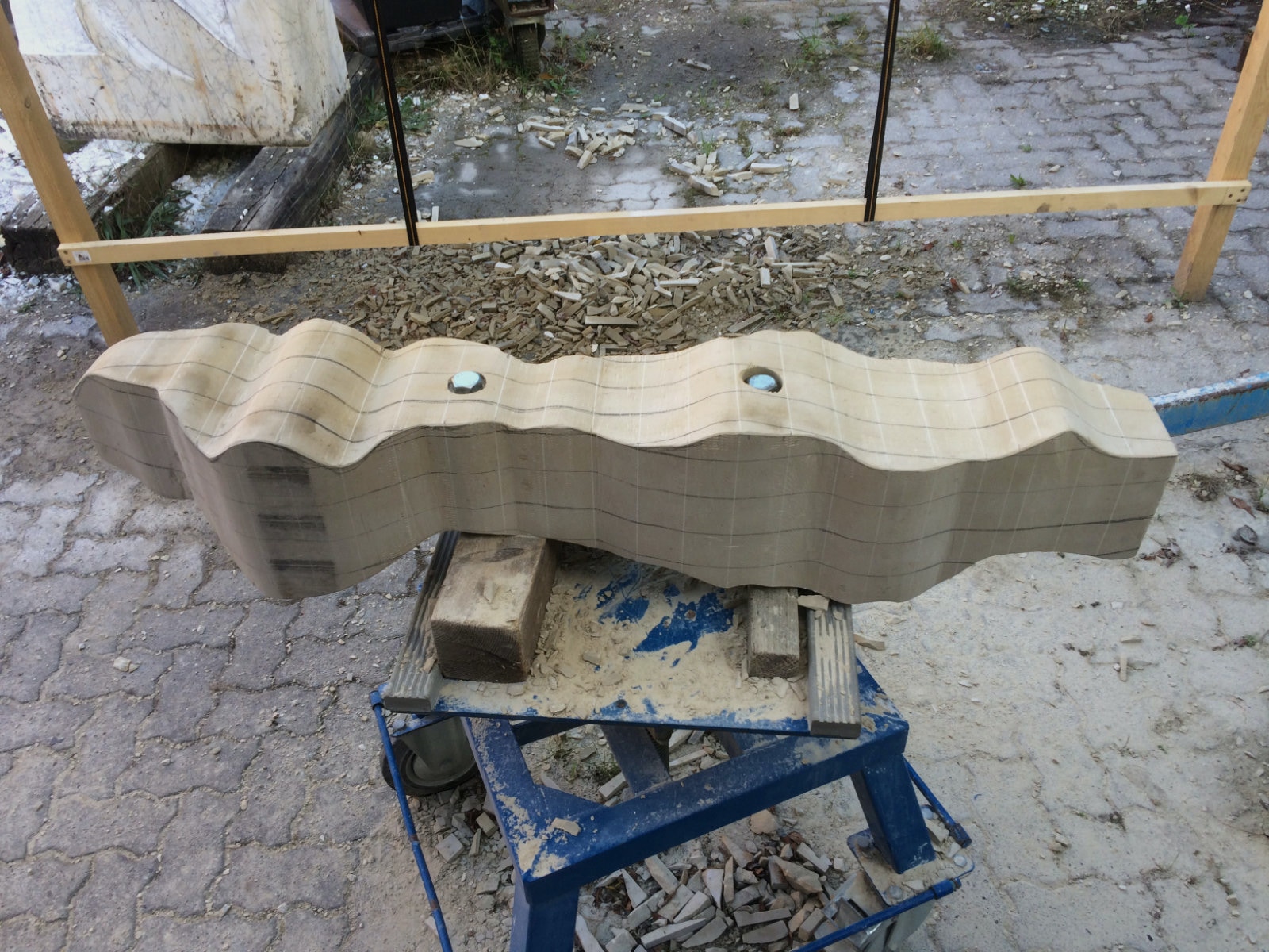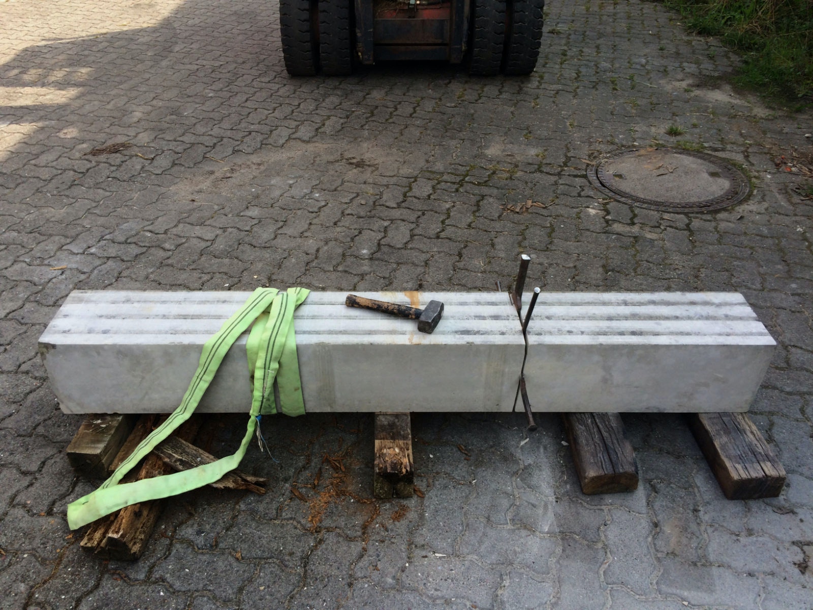 Damit die Arbeit vorangeht, ist nun eine Ausrichtung des Steins durch die Unterstützung von Hölzern gegeben.
