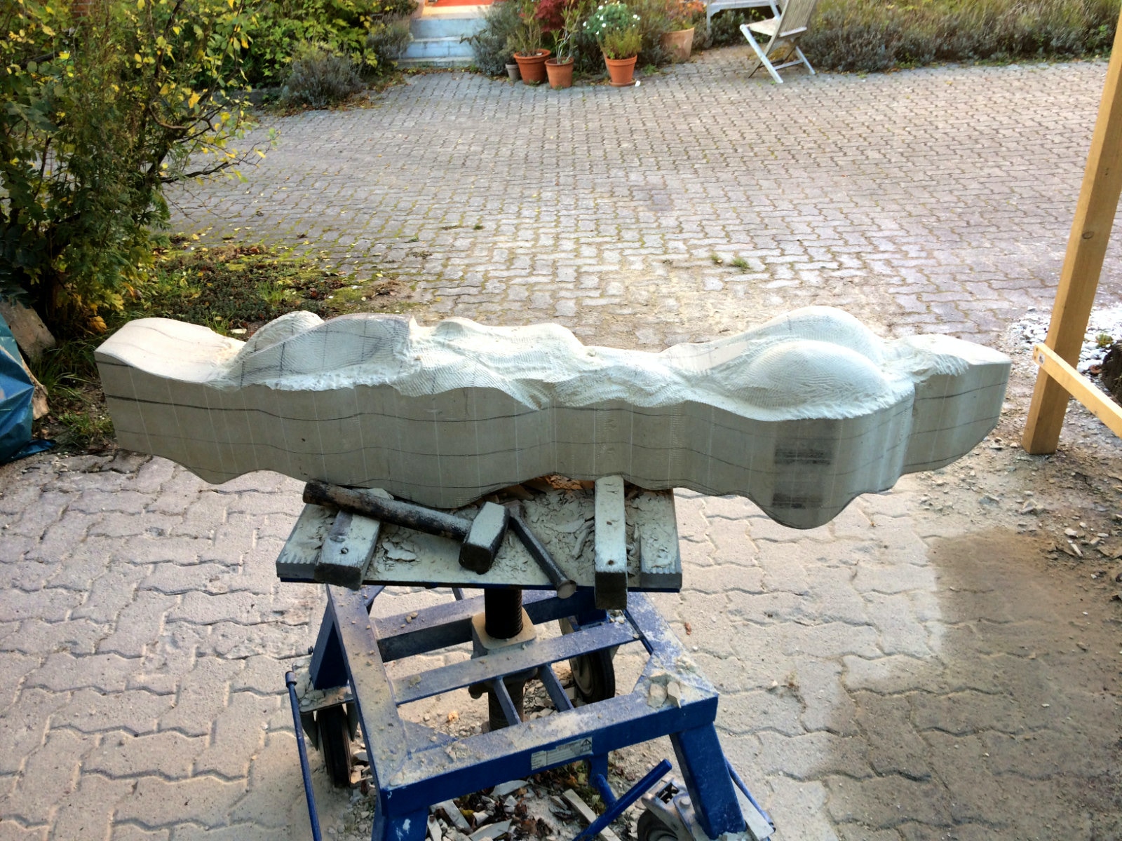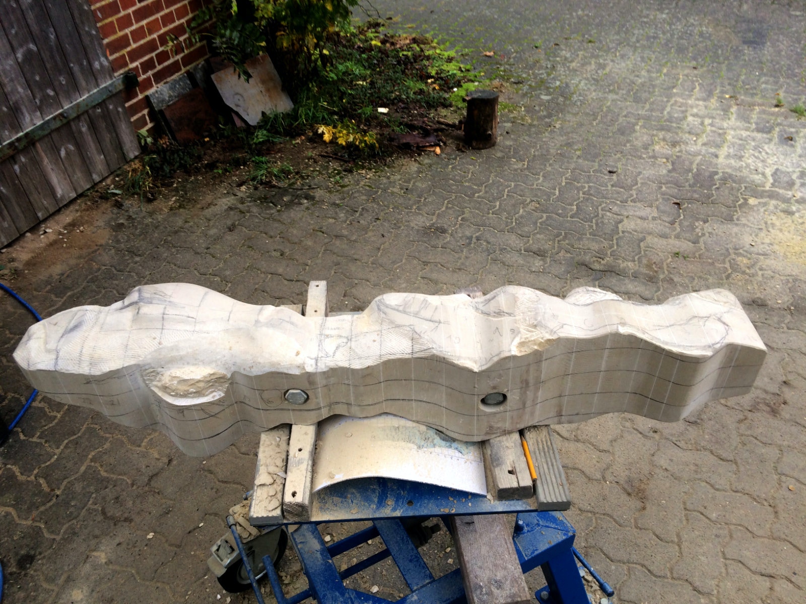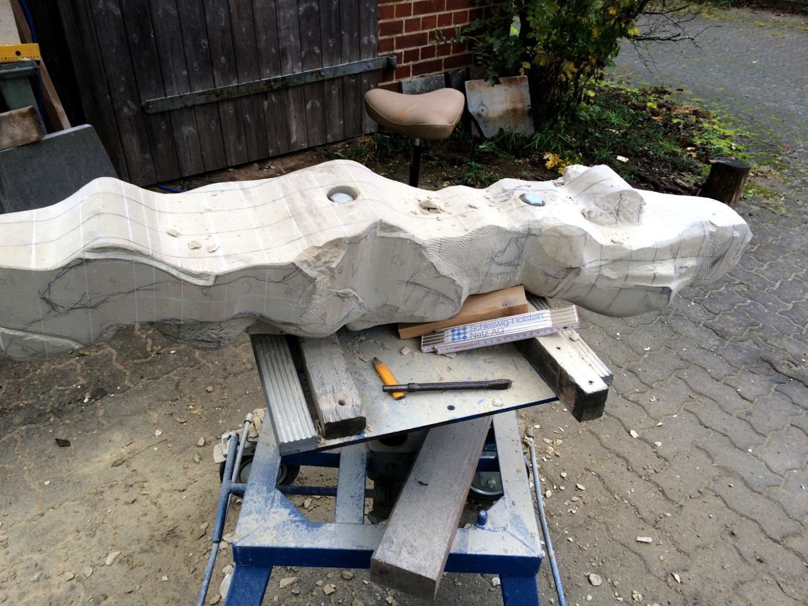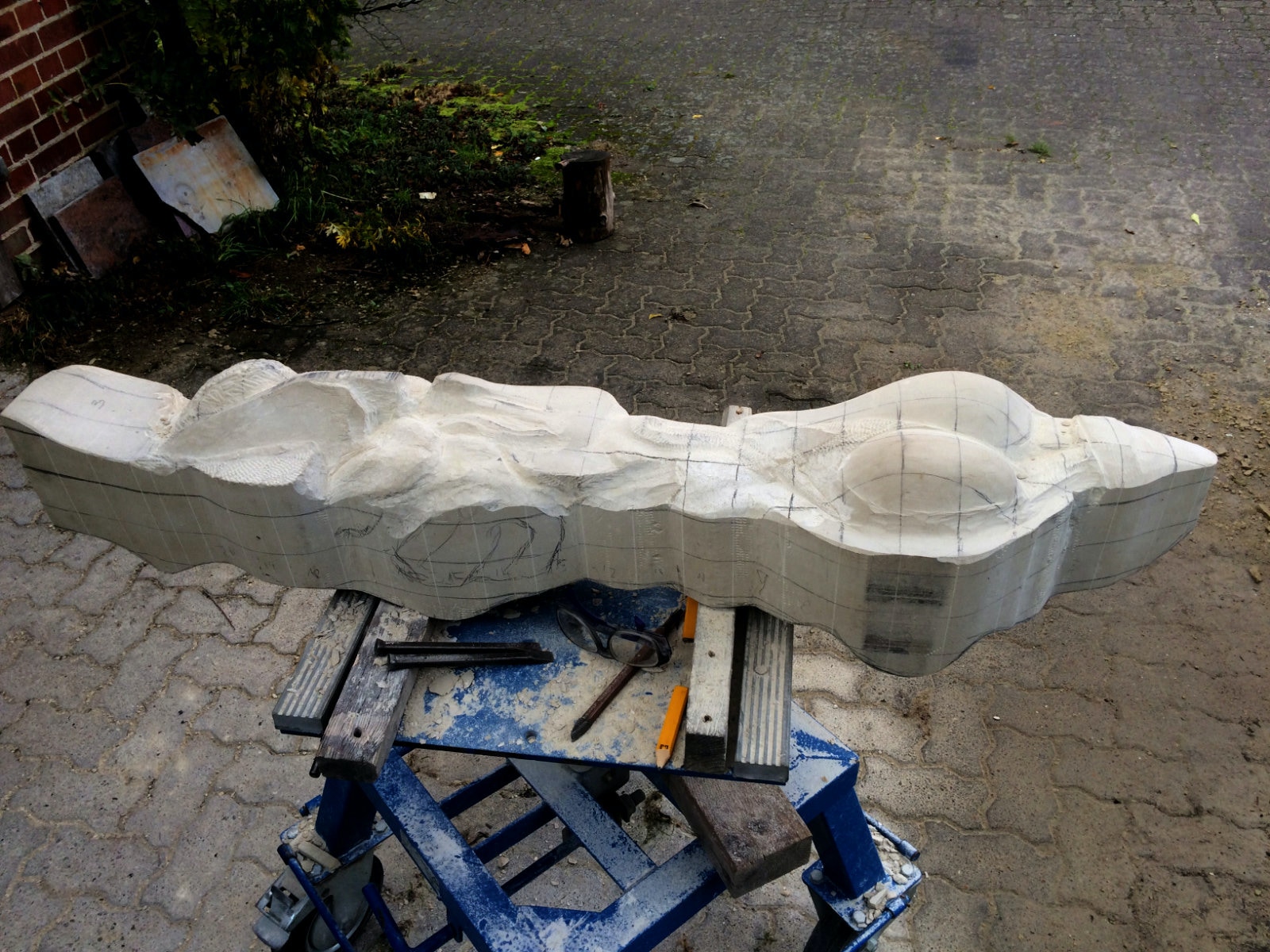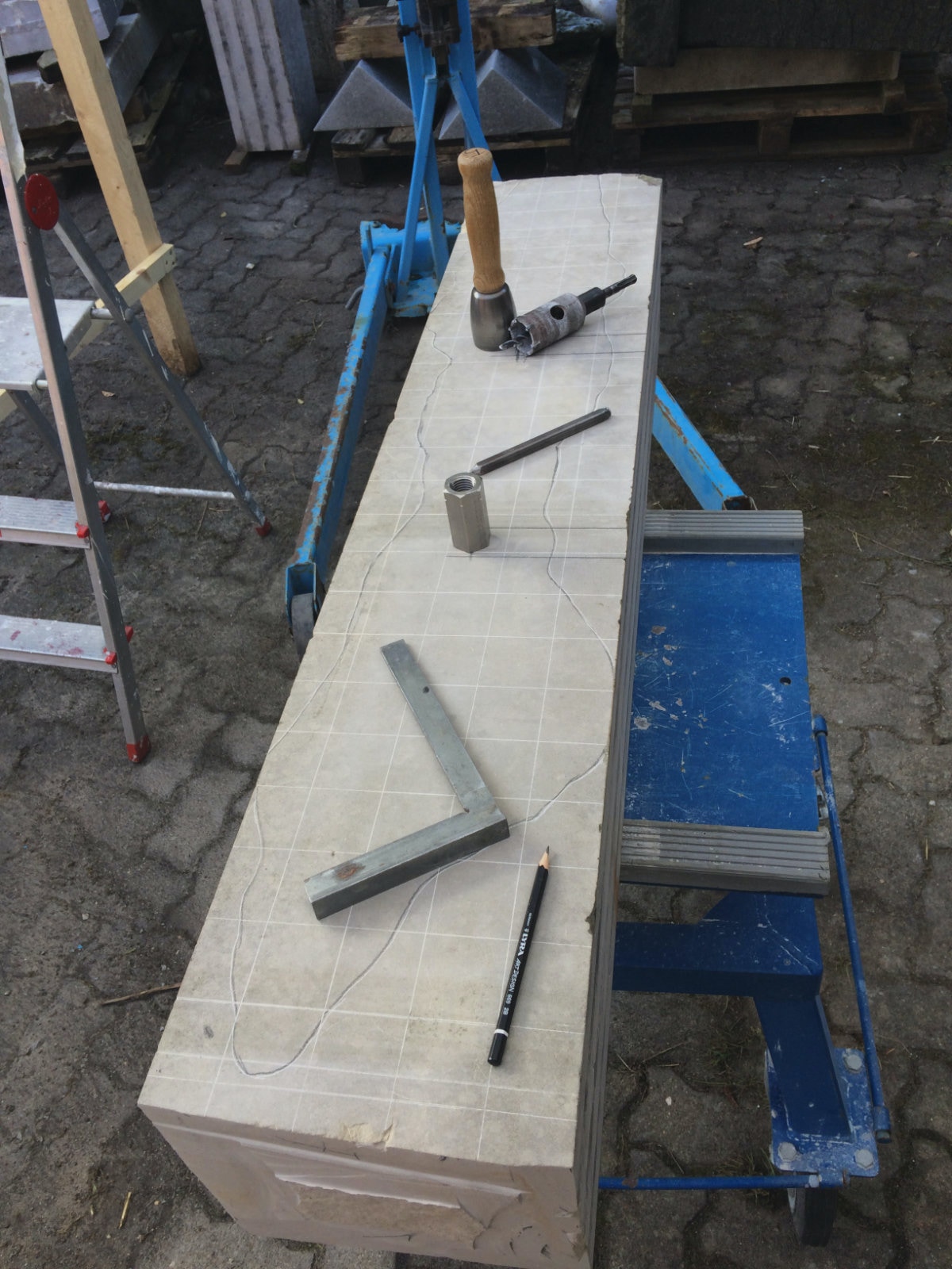 Tatsächlich habe ich nun mein Tagwerk getan und alles erreicht, das ich geplant hatte. Die Zeichnungen auf Architektenpapier übertragen, sogenannte Brettungen aus Pappe hergestellt. Den Stein auf das richtige Maß zugerichteten die Zeichnungen auf das Material aufgebracht. Es gab auch Besucher, war also ein sehr erfolgreicher Tag.