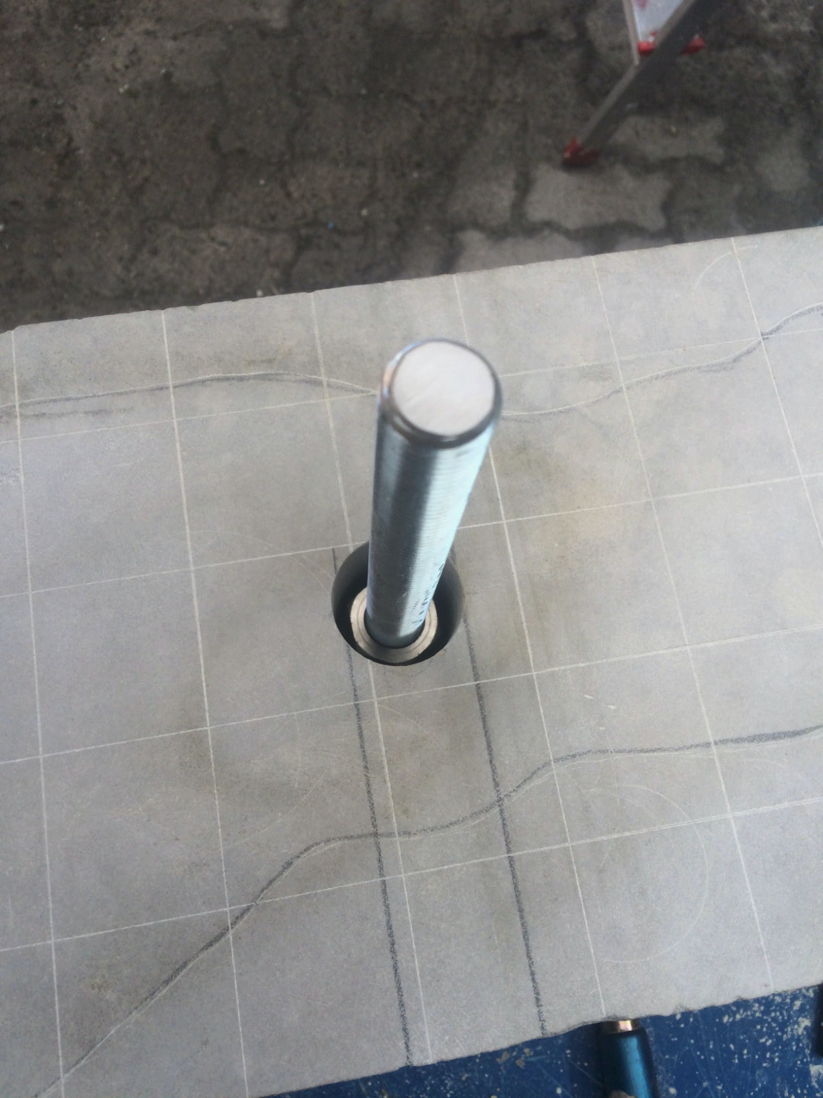 Was angedacht wurde ist erledigt. Die Abbildungen zeigen, dass Bohren und einfügen der Muffen. Eingebettet sind sie dann mit einem Spezialkleber und Winkelrecht ausgerichtet. Der Aufbau ist dadurch gesichert. Die letzten Bilder zeigen das Sogenannte Anbeizen der Aufriss-Zeichnung. Diese Vorbereitung verhindert später ein Abbrechen der Kanten. Die nächste Phase ist nun das Herausarbeiten der Grundform. So sind nun die Kanten geschützt. Montag, den 7.9. geht es weiter.