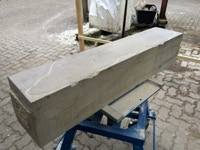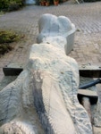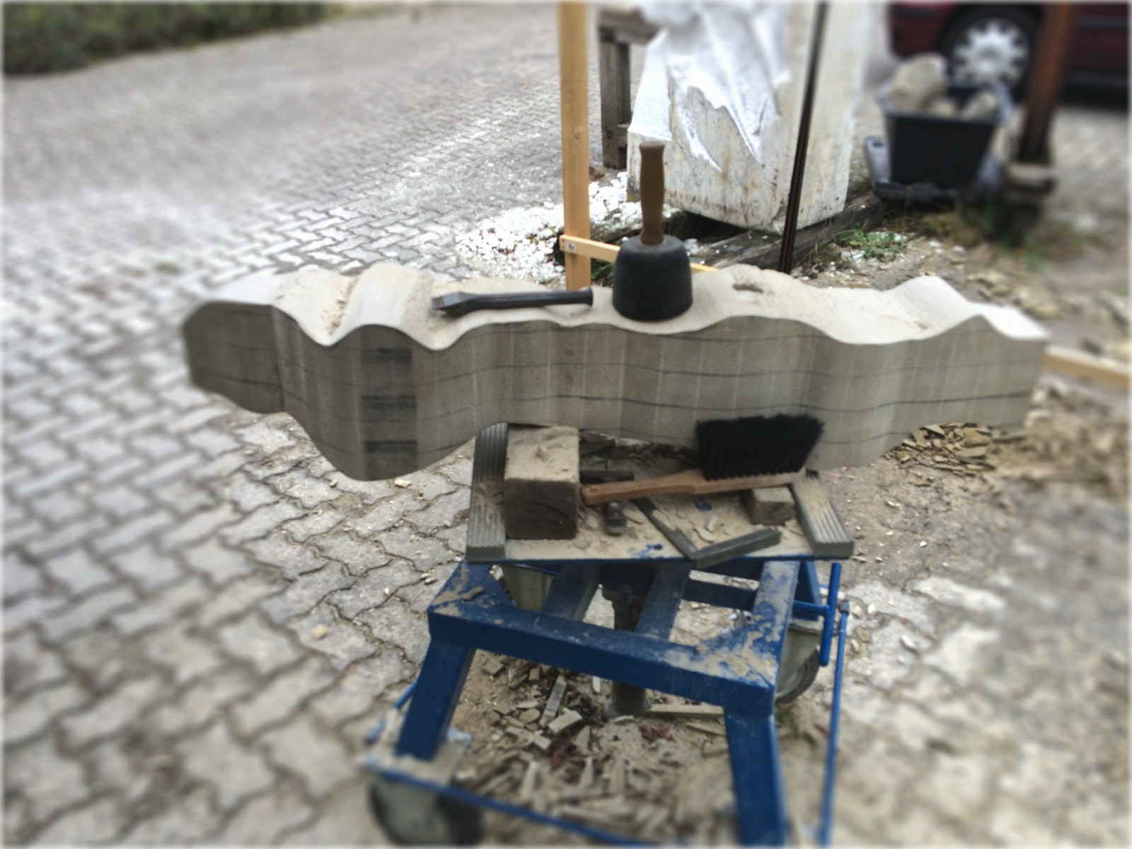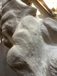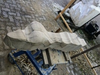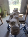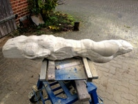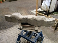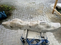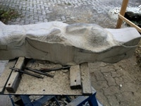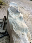 Der zweite Teil der Arbeit sollte natürlich ein erster Versuch sein sich in dem Material zurechtzufinden. Dieser Sandstein ist recht hart und vor allem, wenn er nicht Bruch-frisch ist, ein wenig zickig. Wir haben früher ein solches Verhalten etwas abmildern können, indem wir über mehrere Tage stark gewässerte Jutesäcke über das Material gelegt haben. Nun zeigt sich doch wieder, dass eine gute handwerkliche Ausbildung in der Bildhauerei nicht von Nachteil sein muss. Es sei denn man hat einen Stab von Fachleuten, die diese Arbeit übernehmen.