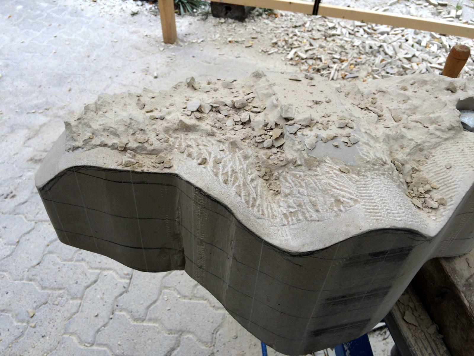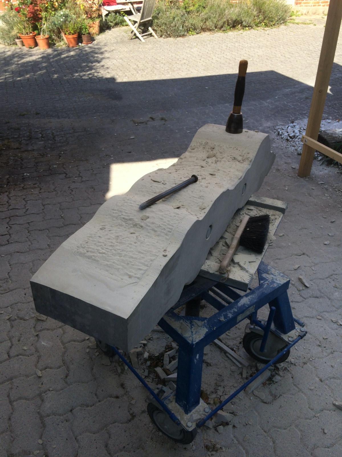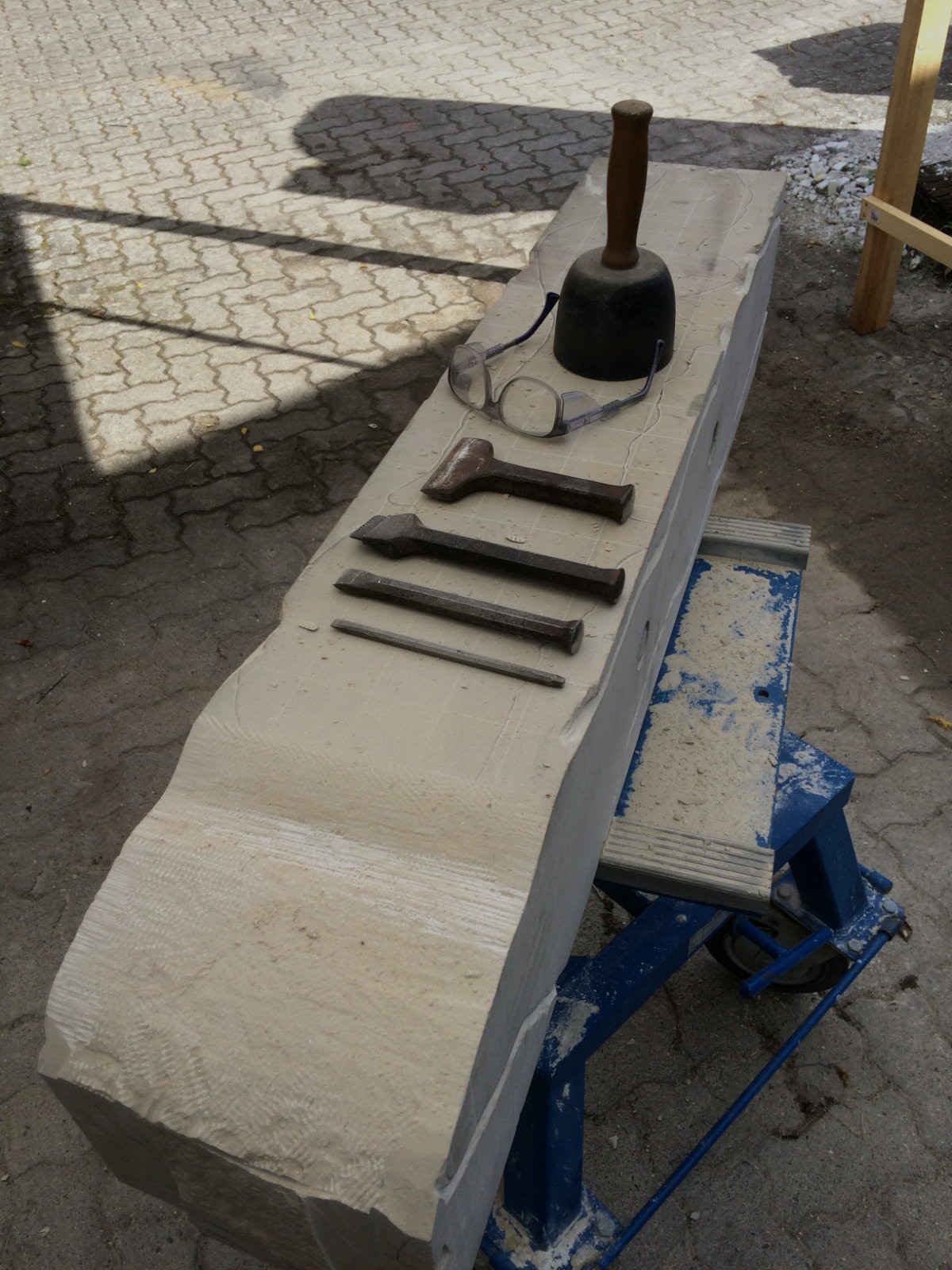 Ein neues, bisher nicht genutztes Werkzeug hat dann auch seinen Eingang in die Arbeit gefunden. Der Stockhammer: Ein schweres mit im Quadrat angeordneten Spitzen versehenes Arbeitsmittel, mit dem sich hervorragend Flächen bearbeiten lassen. Die beiden Videos sollen einen kleinen Eindruck vermitteln. Nachdem die Ebenen mithilfe des Spitzeisens einen großen Teil ihrer Masse verloren haben ist dieses Werkzeug der Ideale Partner in der Nivellierung der Oberfläche. Es folgt die abschließende Bearbeitung mit dem Scharriereisen.