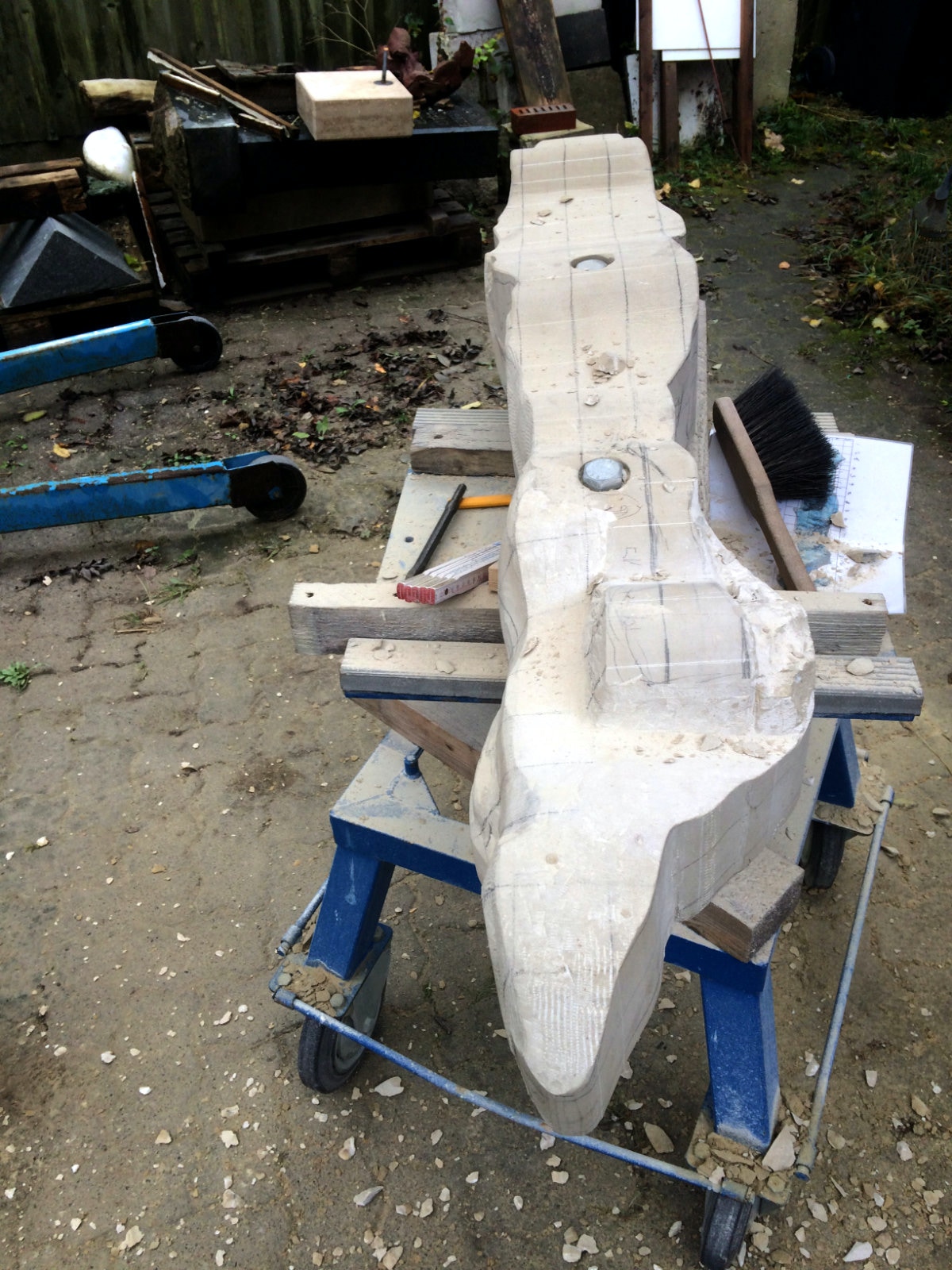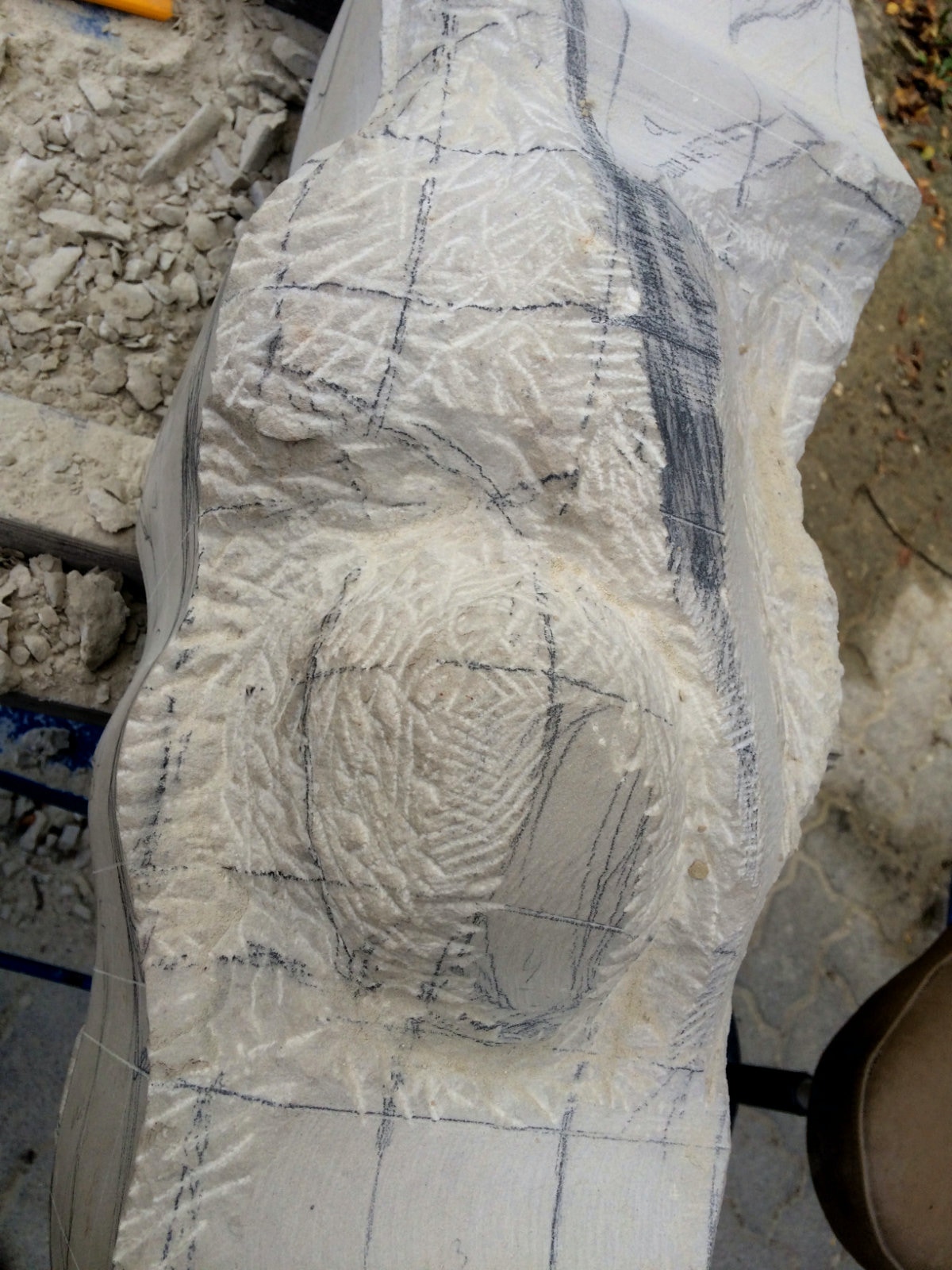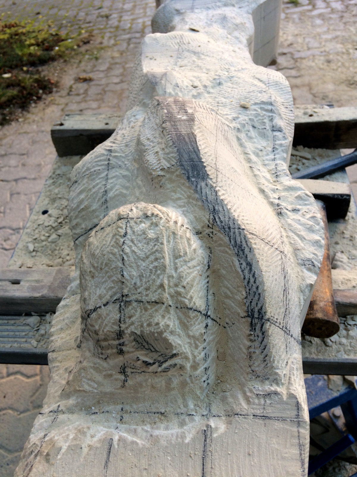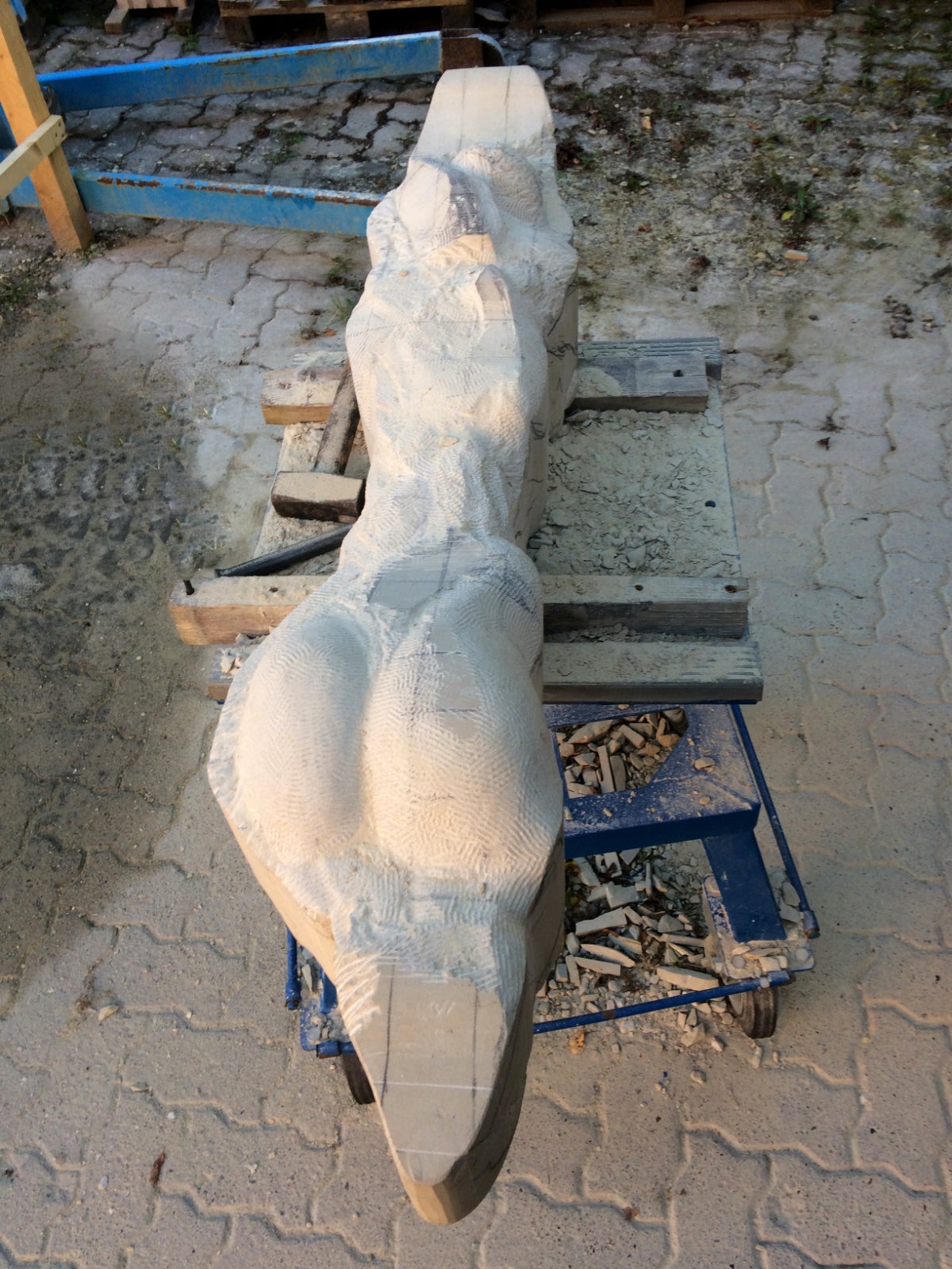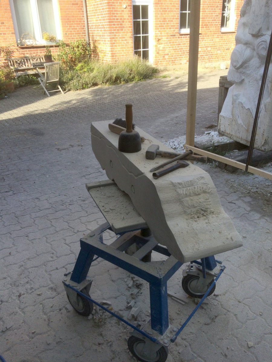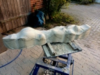 Die Lust am Formen und formulieren ist ungebrochen. Es wechseln Momente intensiver Arbeit an der Figur mit Augenblicken der Zusammenfassung. Überprüfen der Formen, Zusammenhänge und Oberflächengestaltung. Letztere ist nach den ersten Versuchen noch ein wenig weiter gewachsen und ist für einen ausgebildeten Steinmetzen mit einer Überwindung des Erlernten verbunden. Manchmal muss man bewusst mit der Tradition und den entwickelten Arbeitsabläufen, den dem Werkzeug angemessenem Verhalten brechen, um das gewünschte Ergebnis der Idee immer näherzubringen. Parallel zur Weiterentwicklung der einzelnen Abschnitte der Figur wird nun auch gleich eine Oberfläche eingeführt, die das Ergebnis, die Erscheinung, Anmutung der ganzen Figur steigern soll. Immer wieder steht die Frage nach der Sichtbarkeit und dem optischen Eindruck eines sich im Wasser bewegenden Körpers in der Diskussion. Wie setze ich dieses gewünschte Ziel technisch und ästhetisch um? Welche Korrespondenz ist zischen der Form und der Oberfläche notwendig um dem geneigten Betrachter den Genuss zu verschaffen, Absicht und Ausführung in einzigartiger und überzeugender Weise zu verschmelzen? Ich hoffe, es wird gelingen und mit diesem Wunsch stürze ich mich nun morgen in die vorletzte Woche.