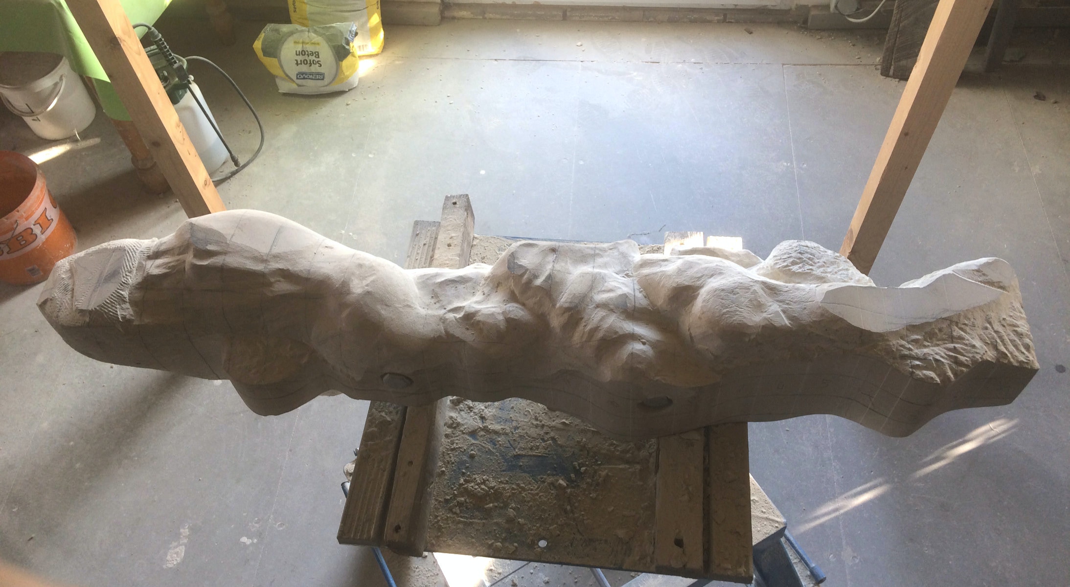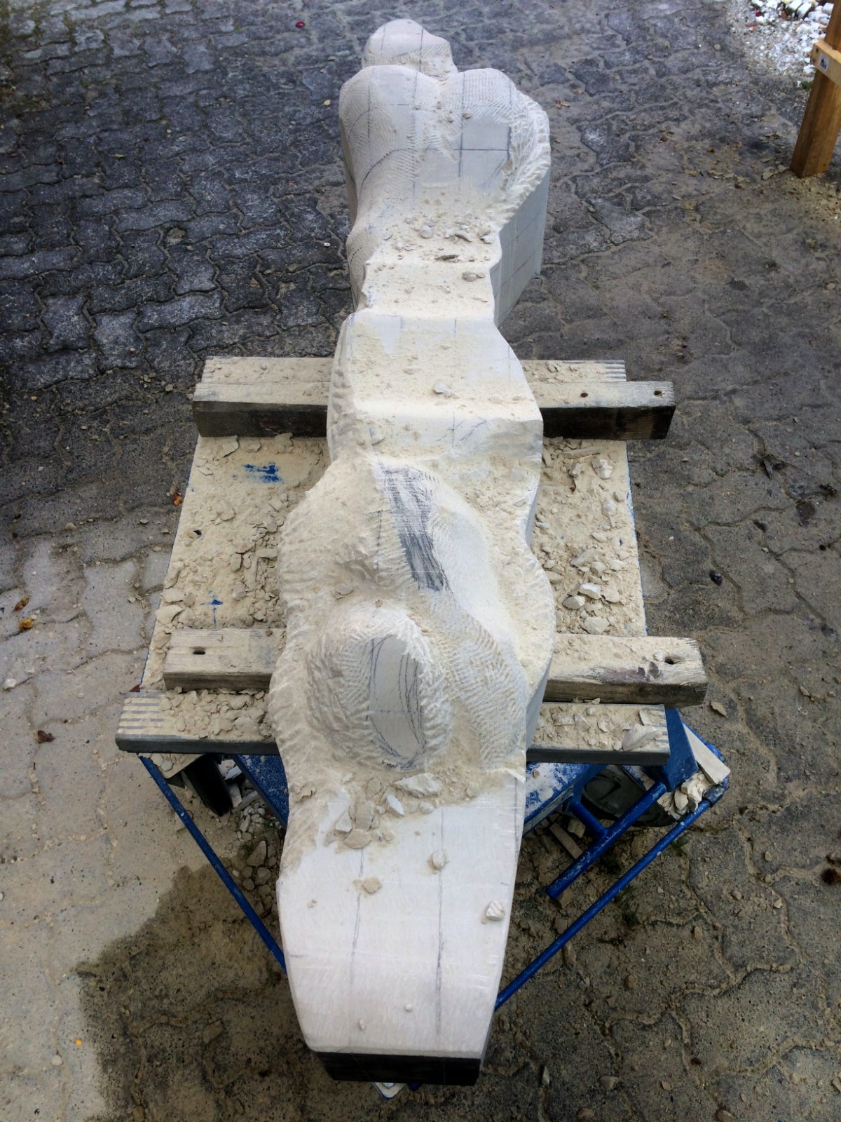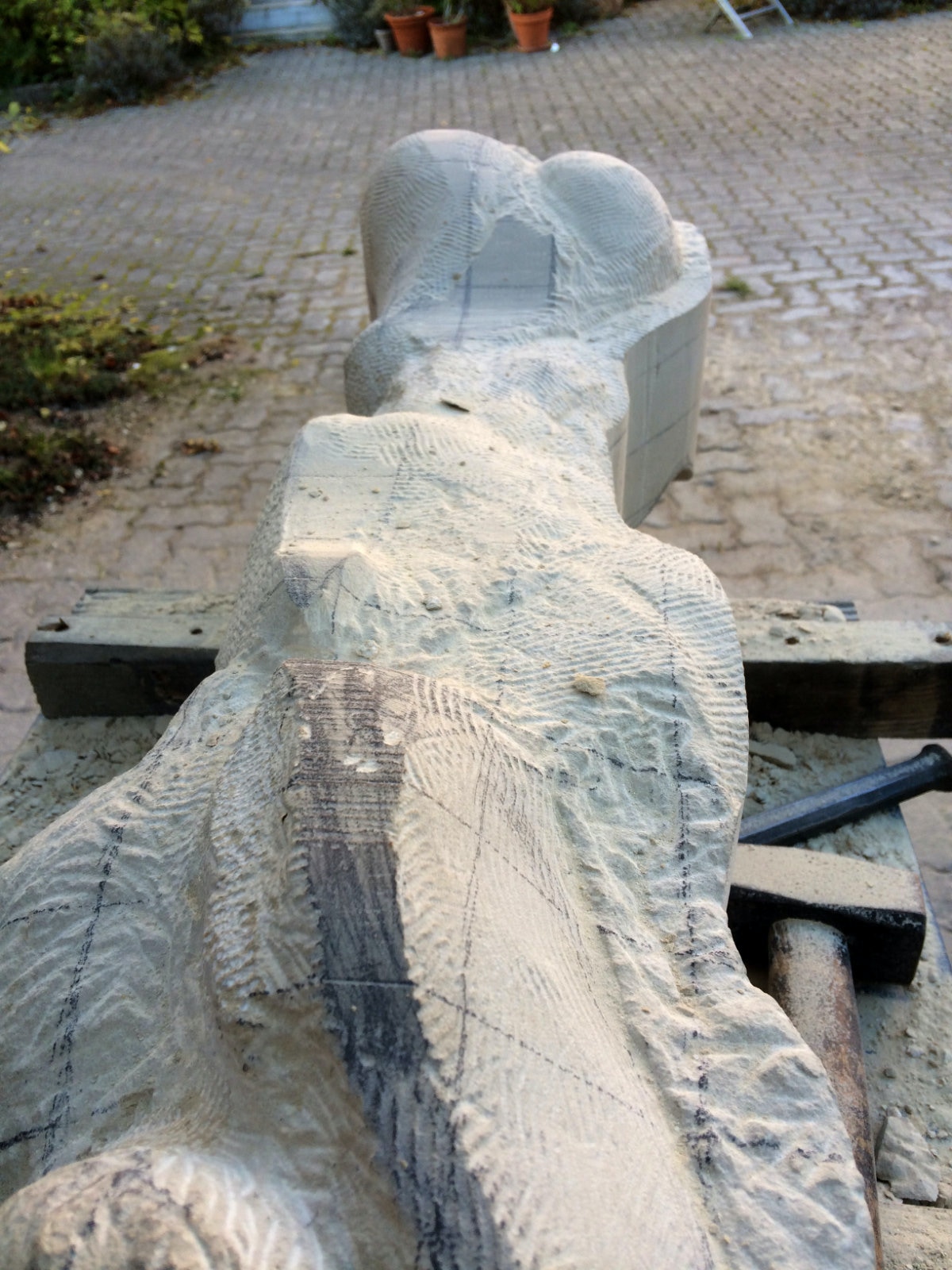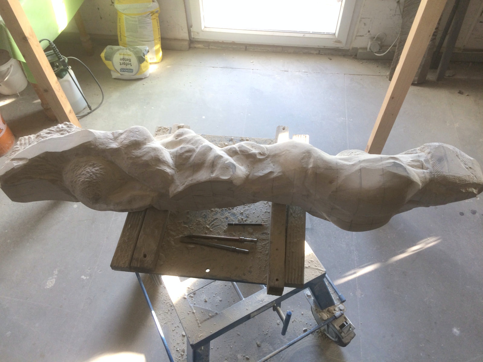 Die Lust am Formen und formulieren ist ungebrochen. Es wechseln Momente intensiver Arbeit an der Figur mit Augenblicken der Zusammenfassung. Überprüfen der Formen, Zusammenhänge und Oberflächengestaltung. Letztere ist nach den ersten Versuchen noch ein wenig weiter gewachsen und ist für einen ausgebildeten Steinmetzen mit einer Überwindung des Erlernten verbunden. Manchmal muss man bewusst mit der Tradition und den entwickelten Arbeitsabläufen, den dem Werkzeug angemessenem Verhalten brechen, um das gewünschte Ergebnis der Idee immer näherzubringen. Parallel zur Weiterentwicklung der einzelnen Abschnitte der Figur wird nun auch gleich eine Oberfläche eingeführt, die das Ergebnis, die Erscheinung, Anmutung der ganzen Figur steigern soll. Immer wieder steht die Frage nach der Sichtbarkeit und dem optischen Eindruck eines sich im Wasser bewegenden Körpers in der Diskussion. Wie setze ich dieses gewünschte Ziel technisch und ästhetisch um? Welche Korrespondenz ist zischen der Form und der Oberfläche notwendig um dem geneigten Betrachter den Genuss zu verschaffen, Absicht und Ausführung in einzigartiger und überzeugender Weise zu verschmelzen? Ich hoffe, es wird gelingen und mit diesem Wunsch stürze ich mich nun morgen in die vorletzte Woche.