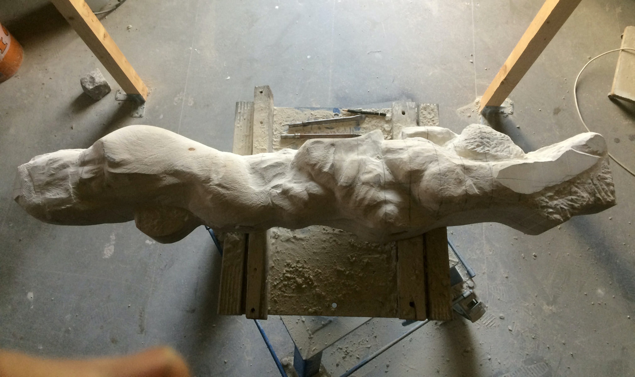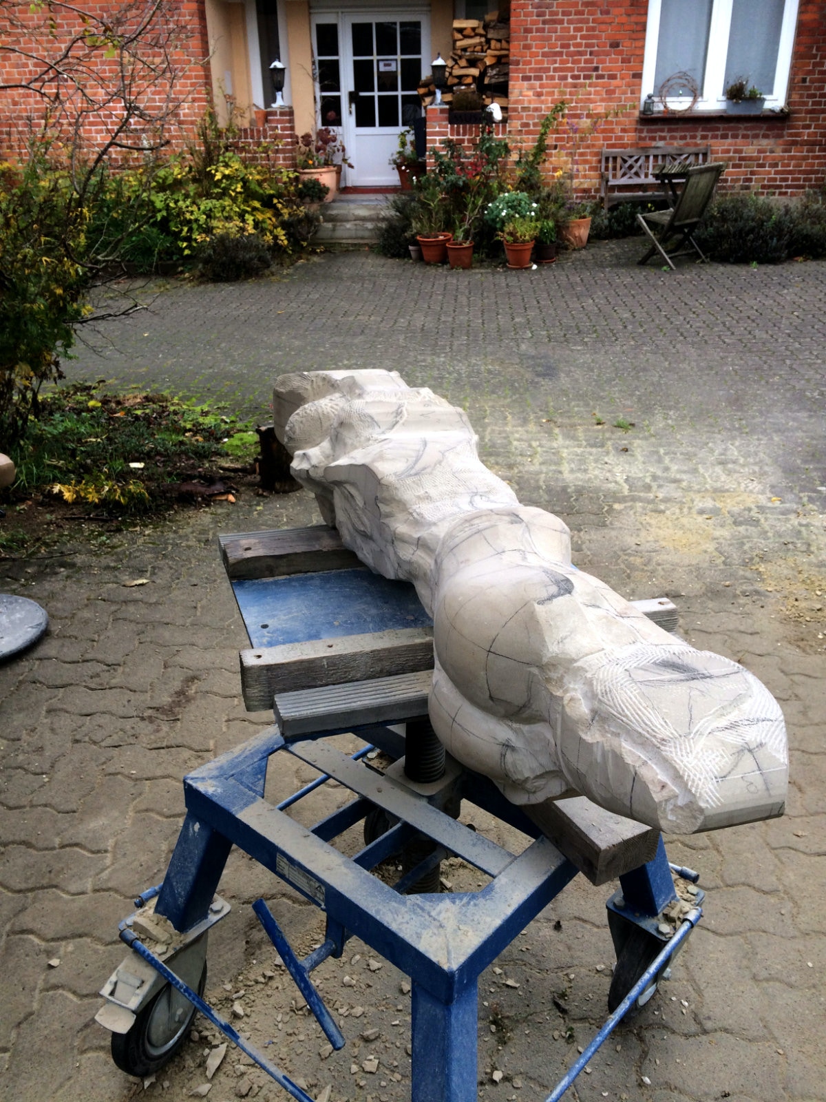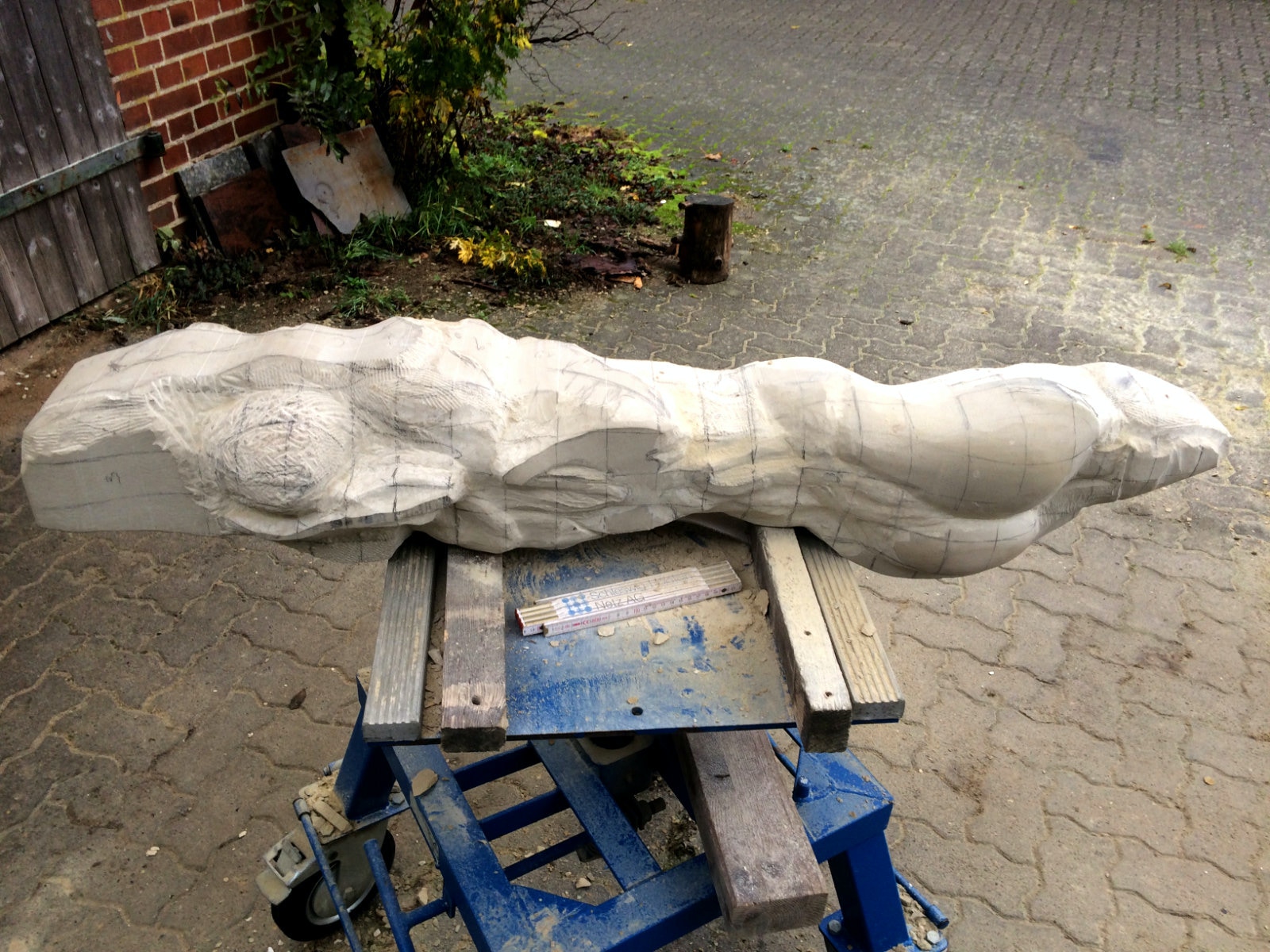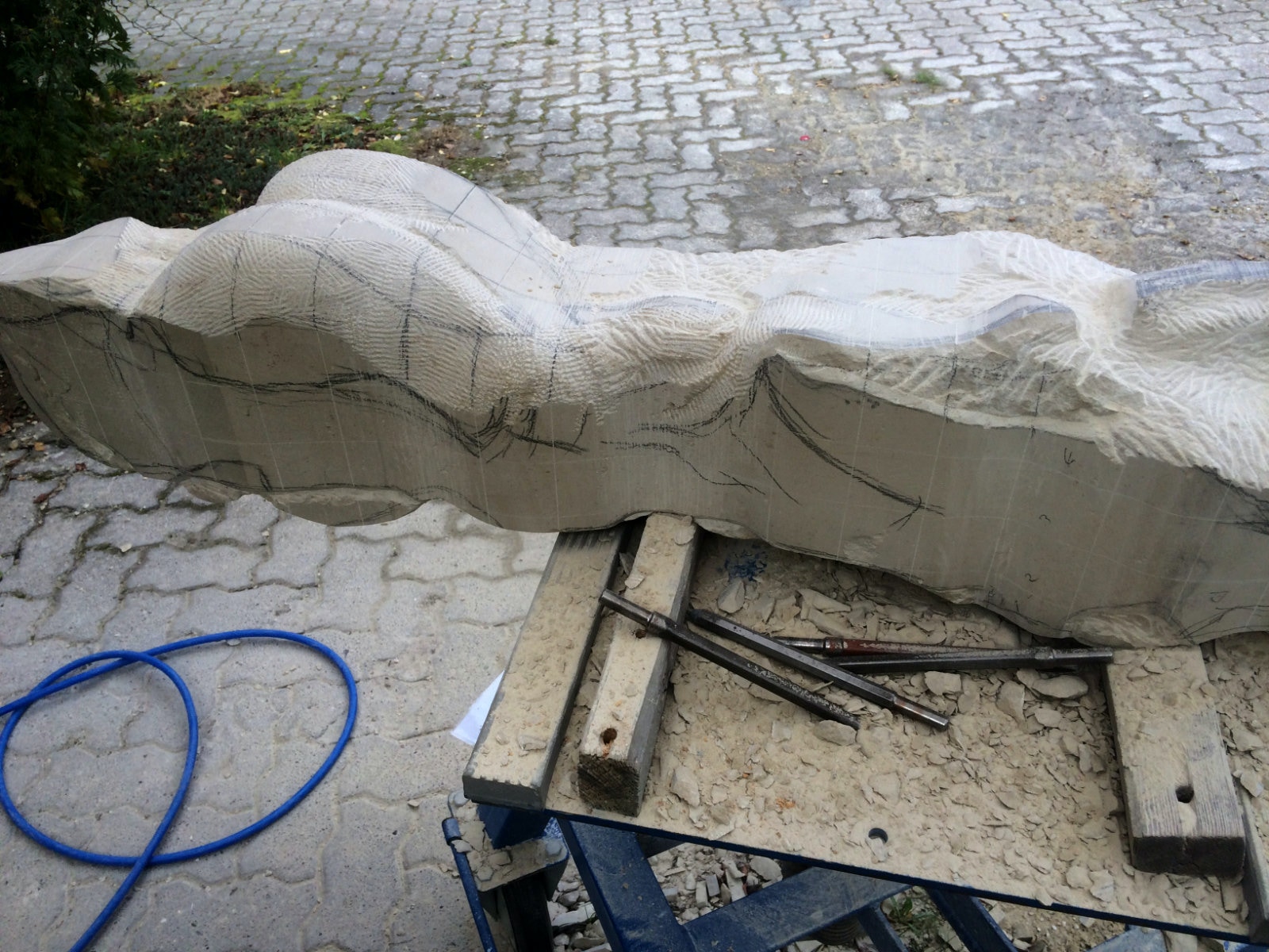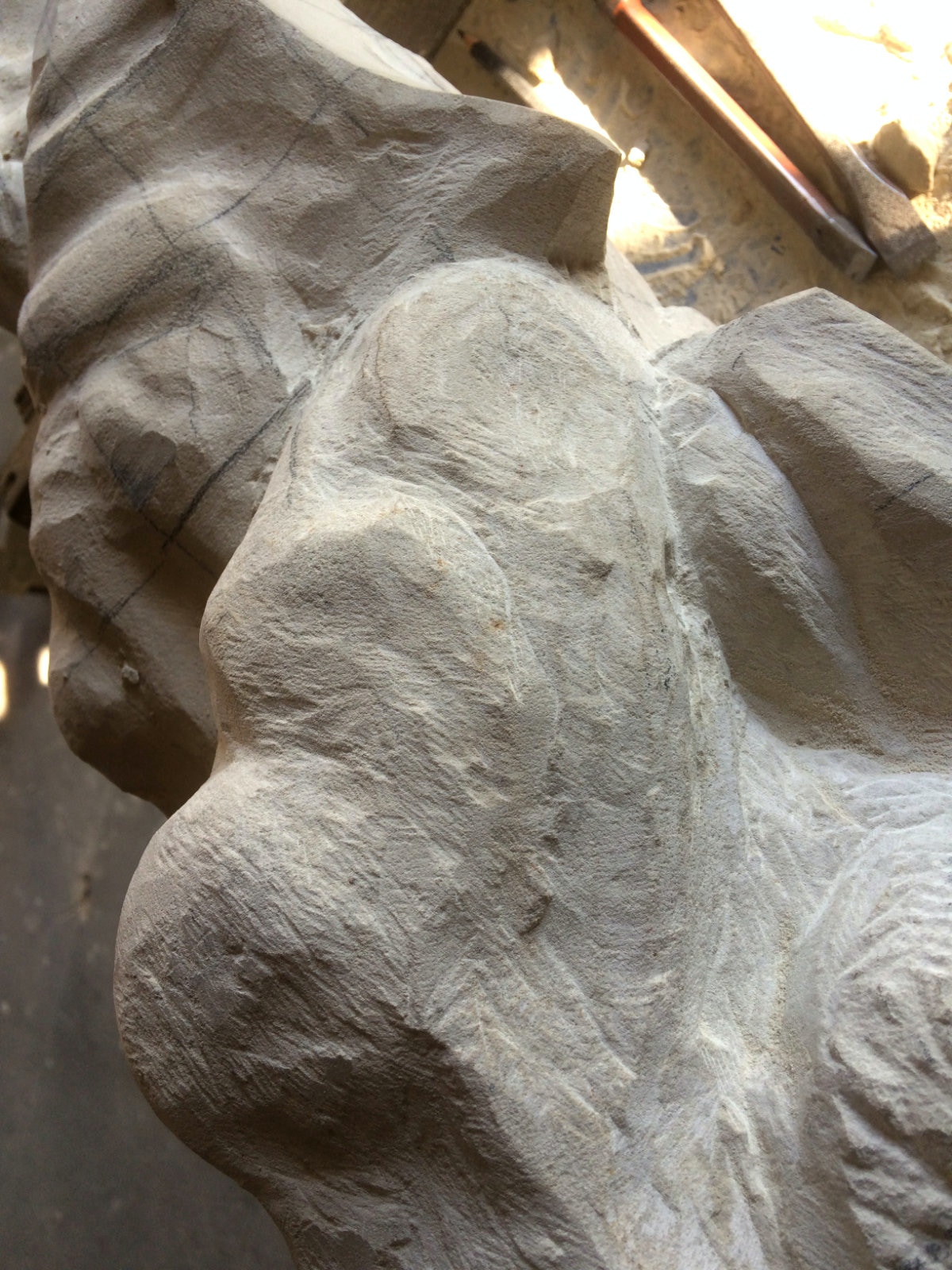 Die Lust am Formen und formulieren ist ungebrochen. Es wechseln Momente intensiver Arbeit an der Figur mit Augenblicken der Zusammenfassung. Überprüfen der Formen, Zusammenhänge und Oberflächengestaltung. Letztere ist nach den ersten Versuchen noch ein wenig weiter gewachsen und ist für einen ausgebildeten Steinmetzen mit einer Überwindung des Erlernten verbunden. Manchmal muss man bewusst mit der Tradition und den entwickelten Arbeitsabläufen, den dem Werkzeug angemessenem Verhalten brechen, um das gewünschte Ergebnis der Idee immer näherzubringen. Parallel zur Weiterentwicklung der einzelnen Abschnitte der Figur wird nun auch gleich eine Oberfläche eingeführt, die das Ergebnis, die Erscheinung, Anmutung der ganzen Figur steigern soll. Immer wieder steht die Frage nach der Sichtbarkeit und dem optischen Eindruck eines sich im Wasser bewegenden Körpers in der Diskussion. Wie setze ich dieses gewünschte Ziel technisch und ästhetisch um? Welche Korrespondenz ist zischen der Form und der Oberfläche notwendig um dem geneigten Betrachter den Genuss zu verschaffen, Absicht und Ausführung in einzigartiger und überzeugender Weise zu verschmelzen? Ich hoffe, es wird gelingen und mit diesem Wunsch stürze ich mich nun morgen in die vorletzte Woche.
