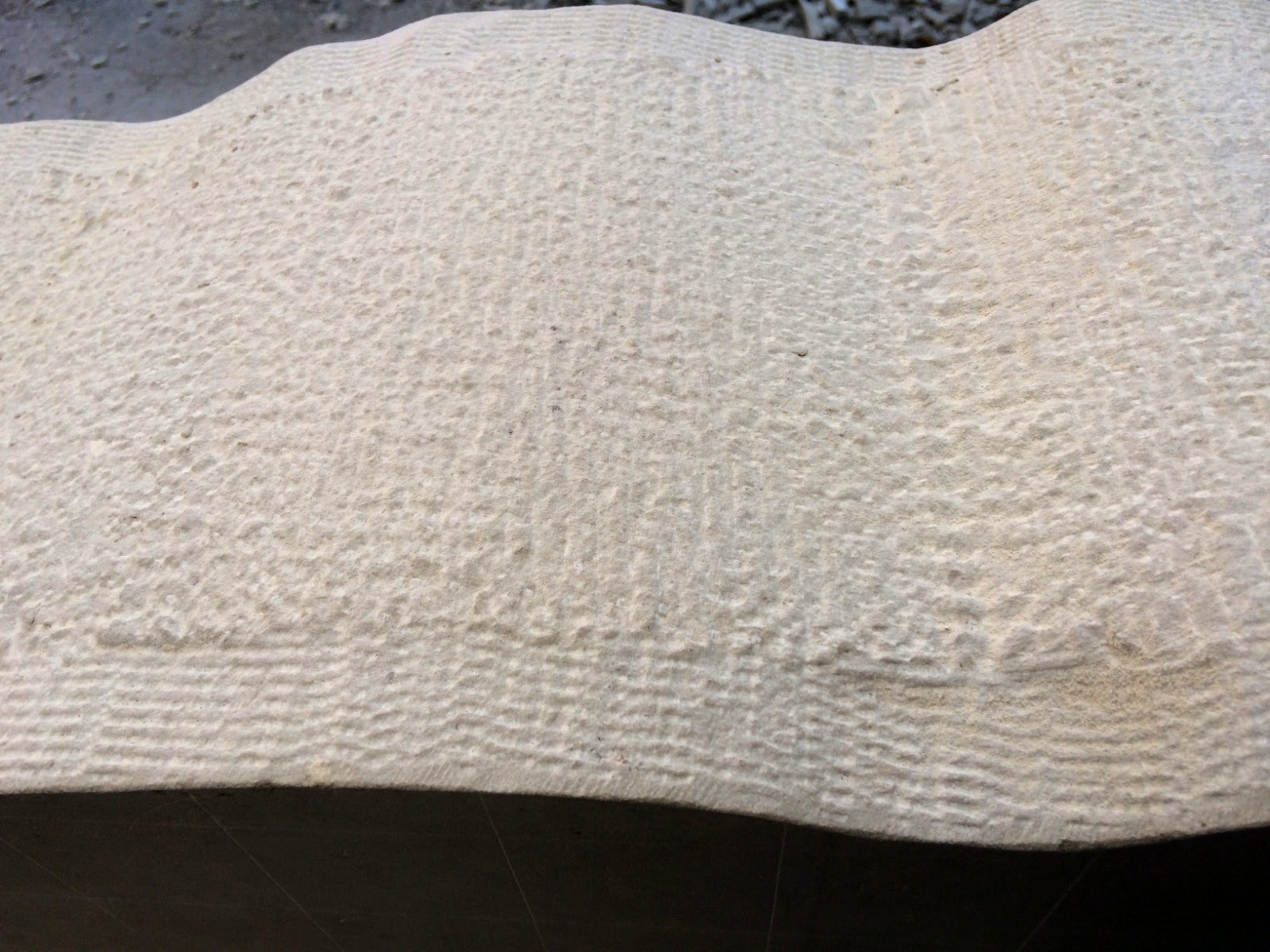 Möglicherweise ist es für den Zuseher interessant einmal die Spuren der Einwirkung des Stockhammers auf die Oberfläche des Obernkirchner Sandsteins zu sehen. Anhand der vorher gezeigten Videos, die hoffentlich für jeden sichtbar waren, kann man deutlich die Gewalt ermessen, mit der die Oberfläche zertrümmert wird. Auch eine starke körperliche Belastung, aber nichtsdestoweniger effektiv.