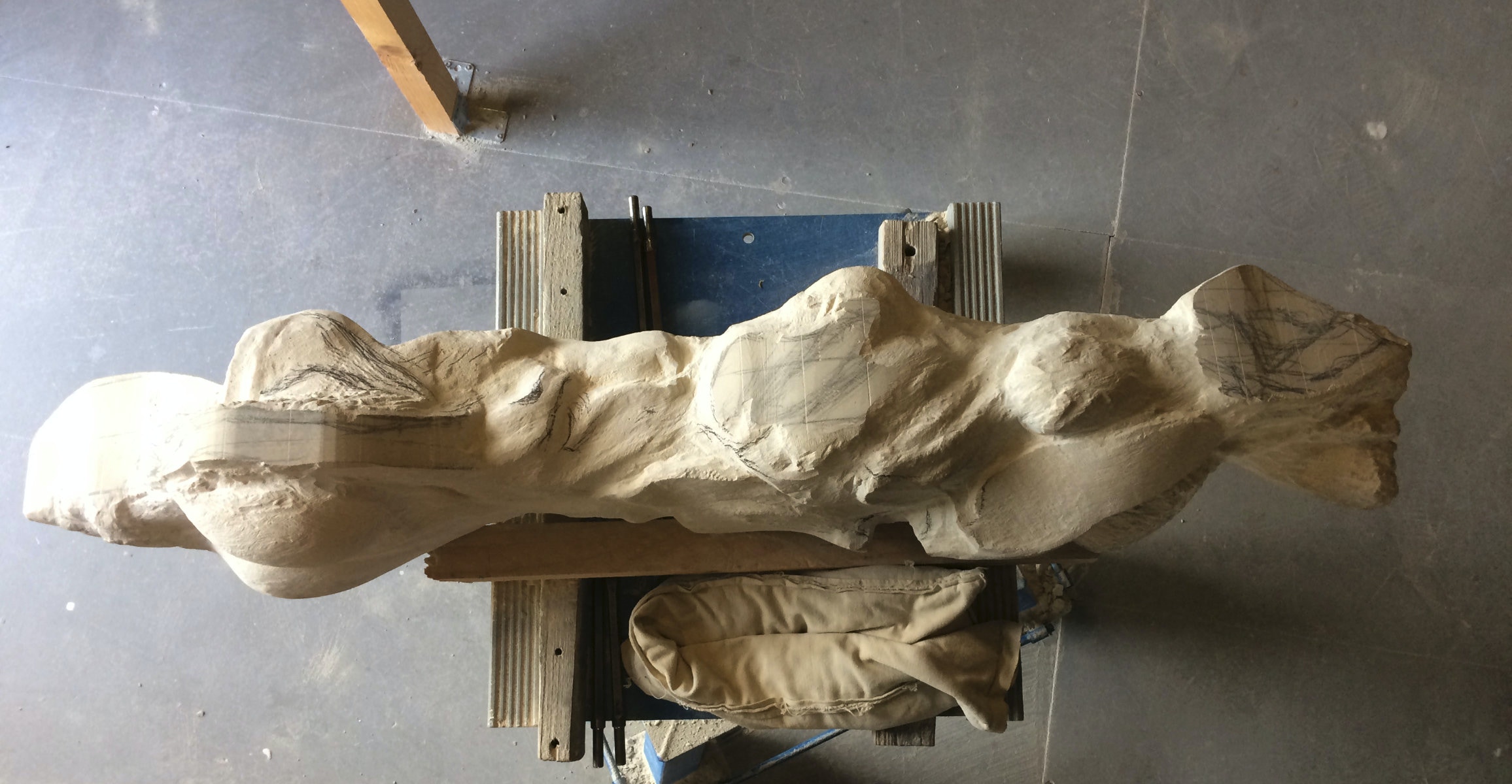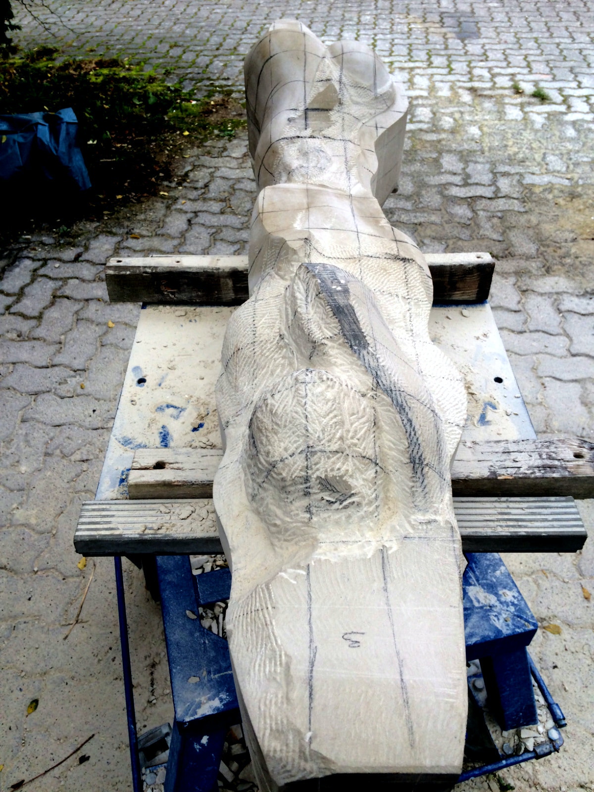 Deutlich sichtbar wird nun der Sinn der Quadrate. Sie dienen der Orientierung und sind durch ihre Linearität auch Verstärker der bereits ausgeführten Formen. Die so deutlicher sichtbaren Profile erleichtern die Formgebung. Die erste Arbeitsphase ist eingeläutet durch das Freilegen der Partien des Gluteus und des Kopfbereiches.