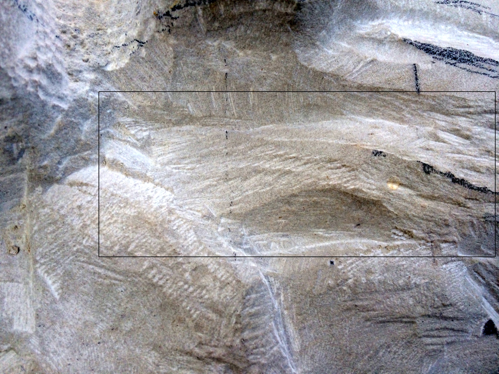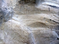 Die Quadrate wurden erneut aufgezeichnet und der Stein gedreht. Deutlich sichtbar wird nun auch wie viel Masse bereits abgetragen ist.