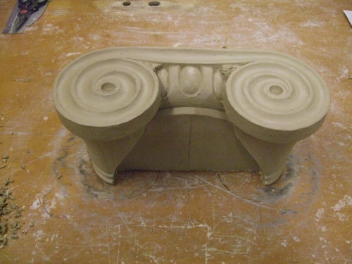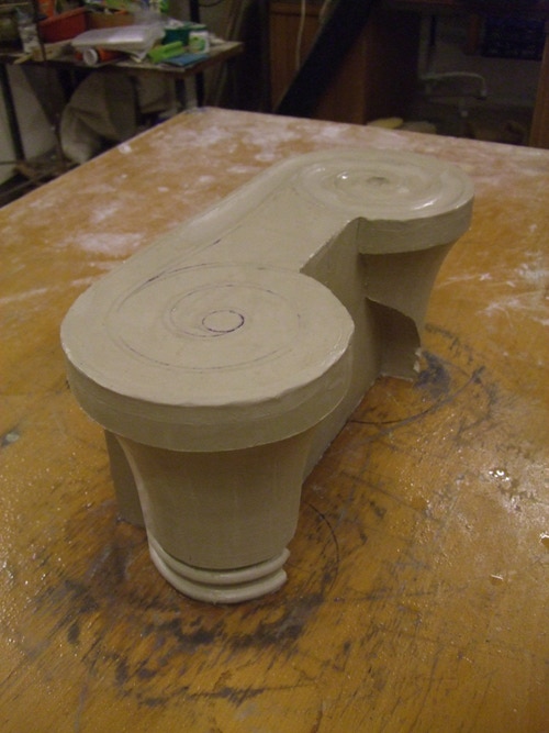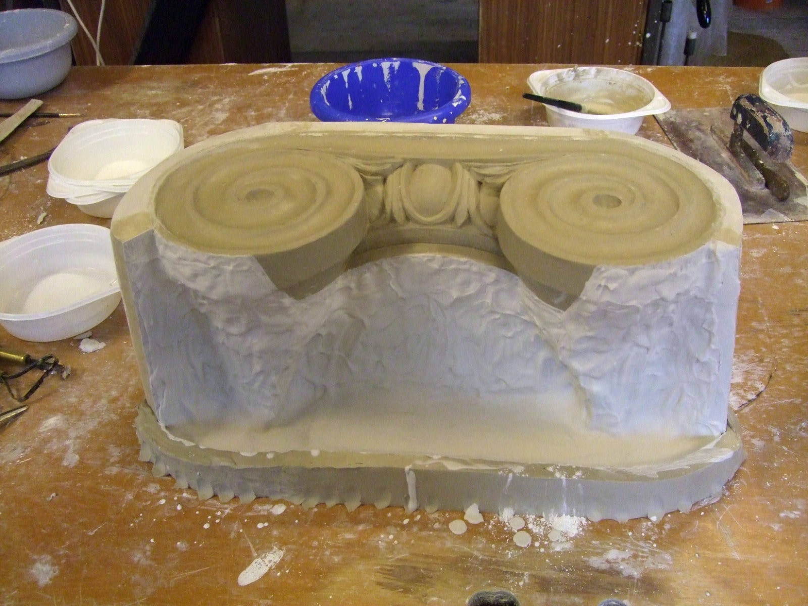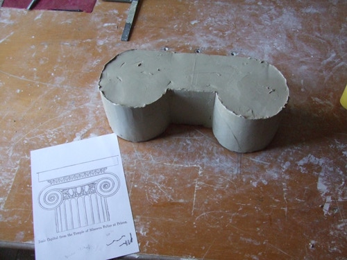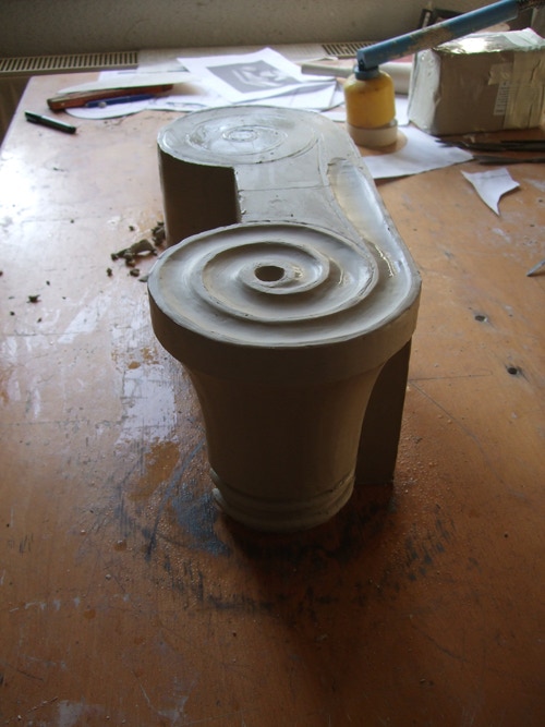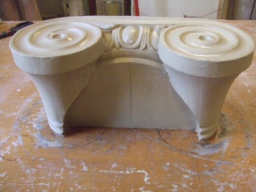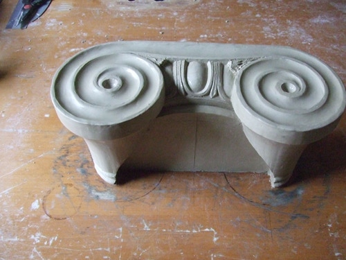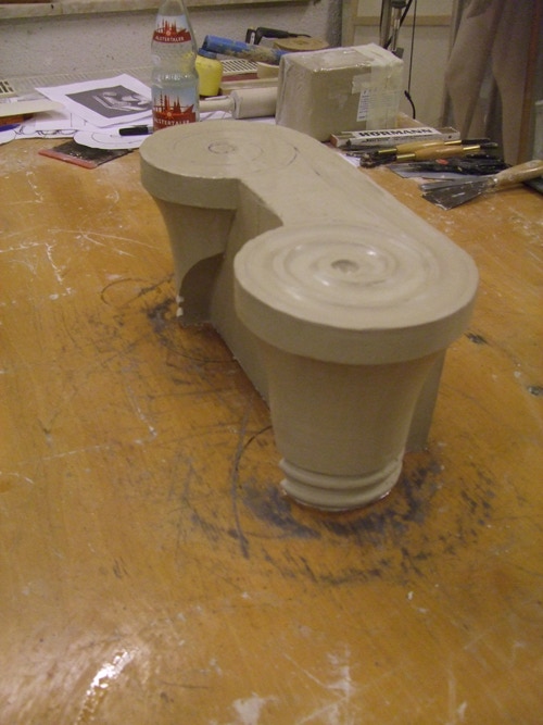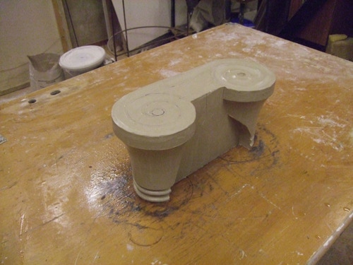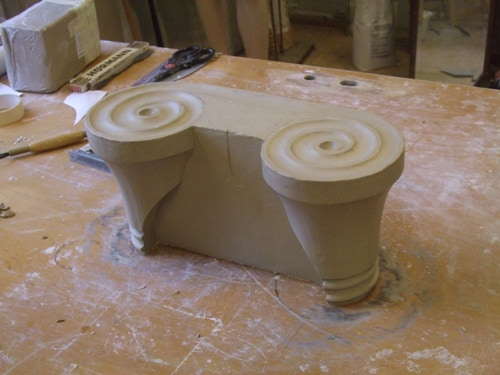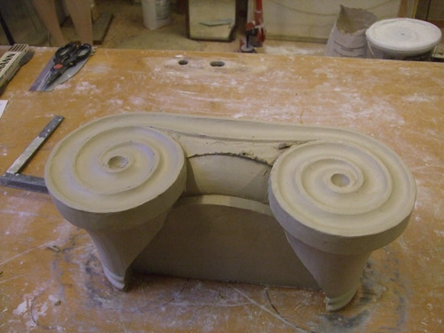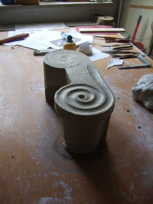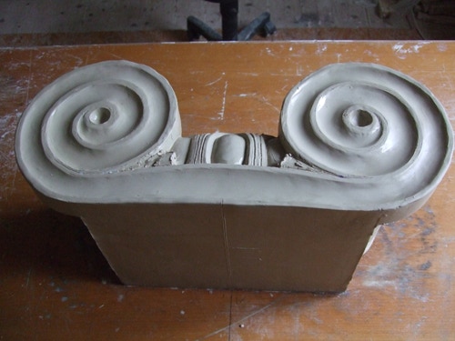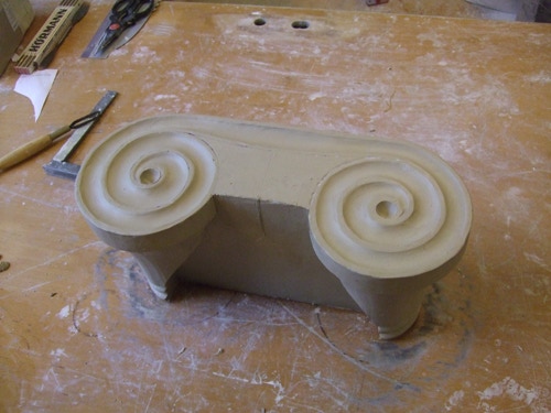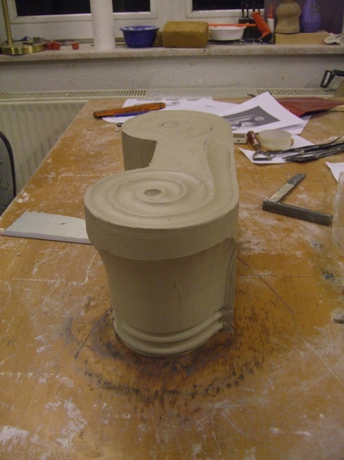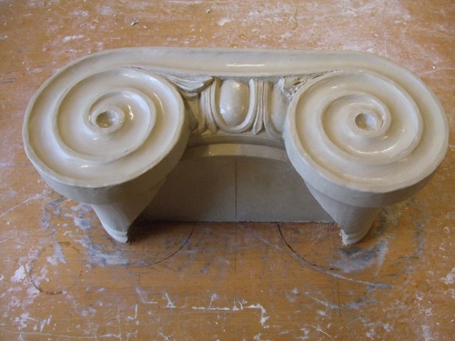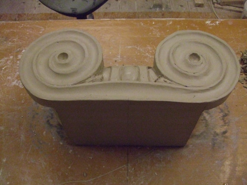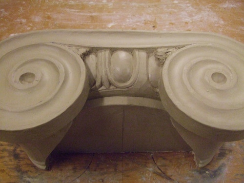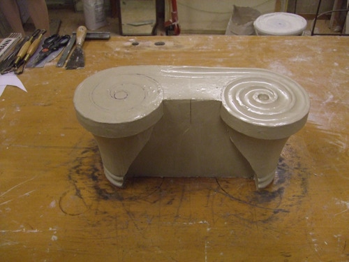 An mich herangetragen wurde die Frage und Bitte zwei Säulen zu fertigen. Sie sollten leicht sein und letztendlich aus zerbrochenen Elementen bestehen. Ich entschied mich für ionische Säulen und zeige erst einmal die Herstellung des Modells, hier des Kapitells, dann die Abformung und das daraus erstellte Positiv.