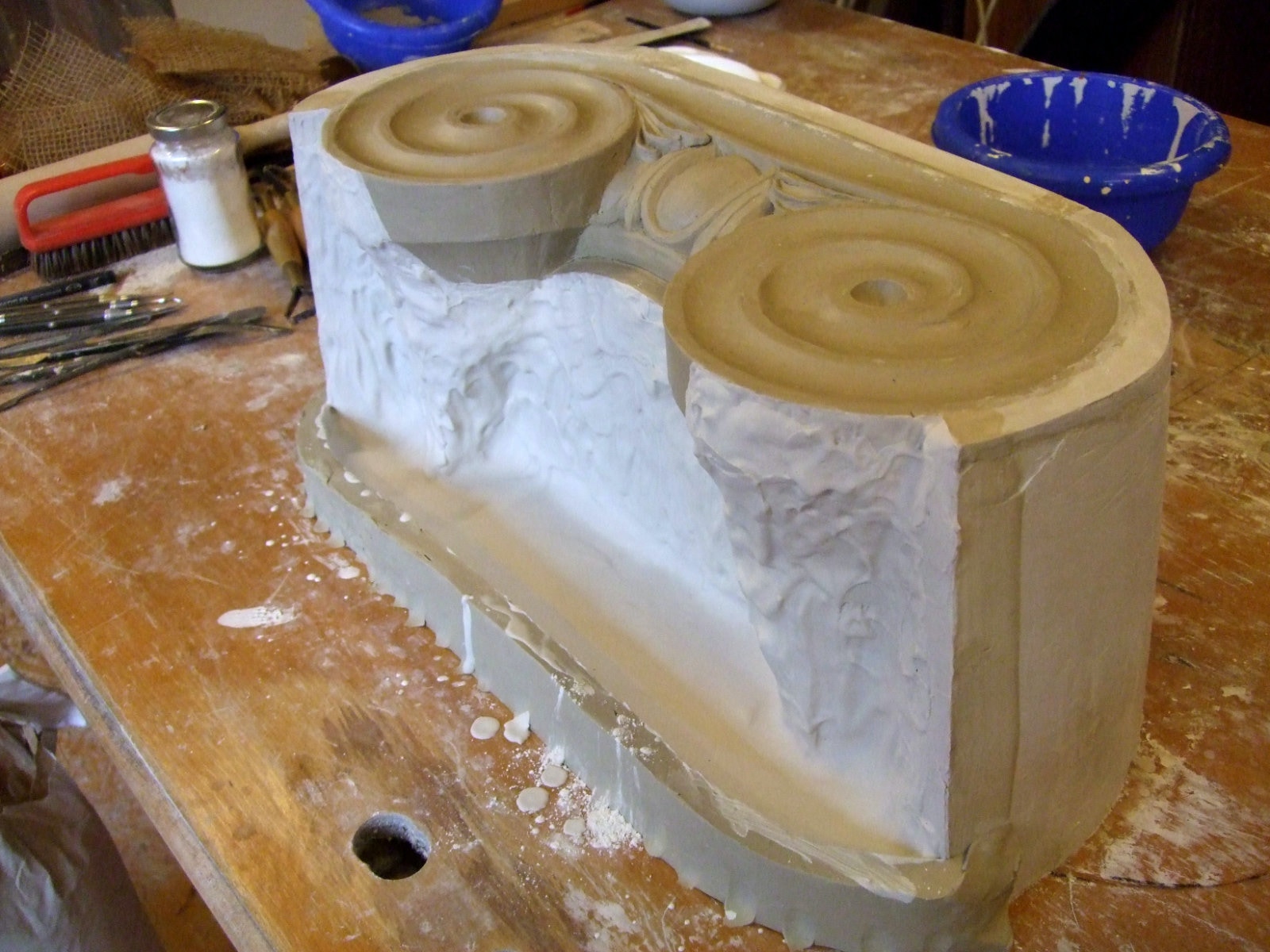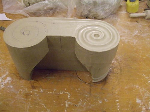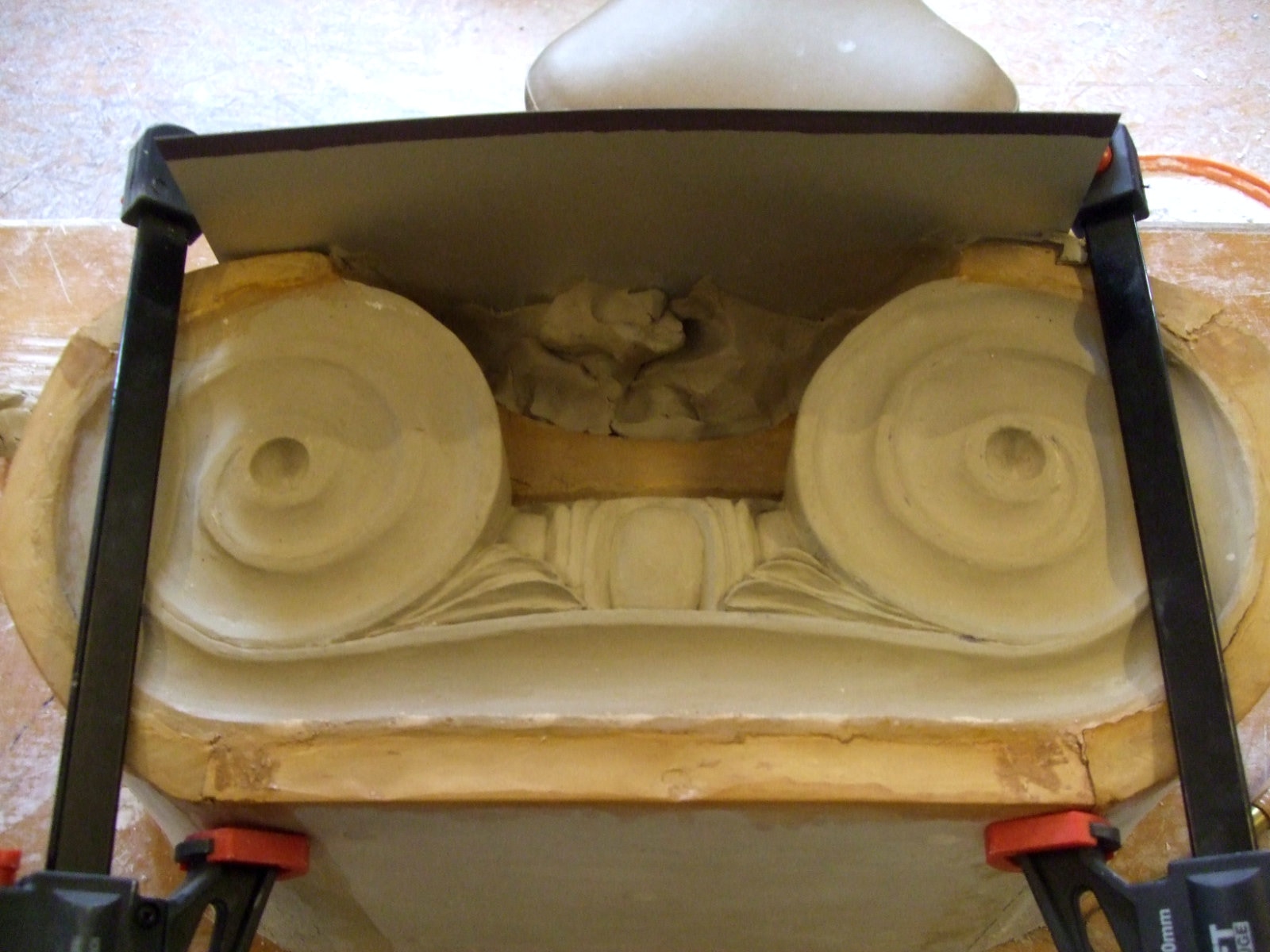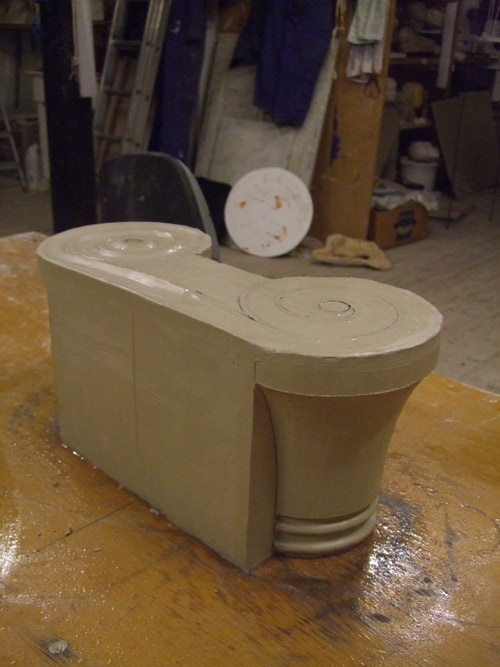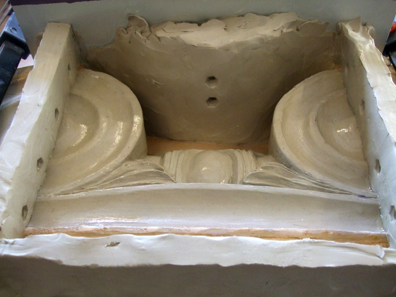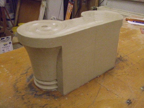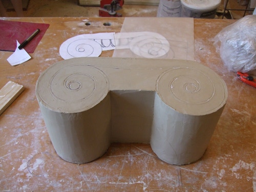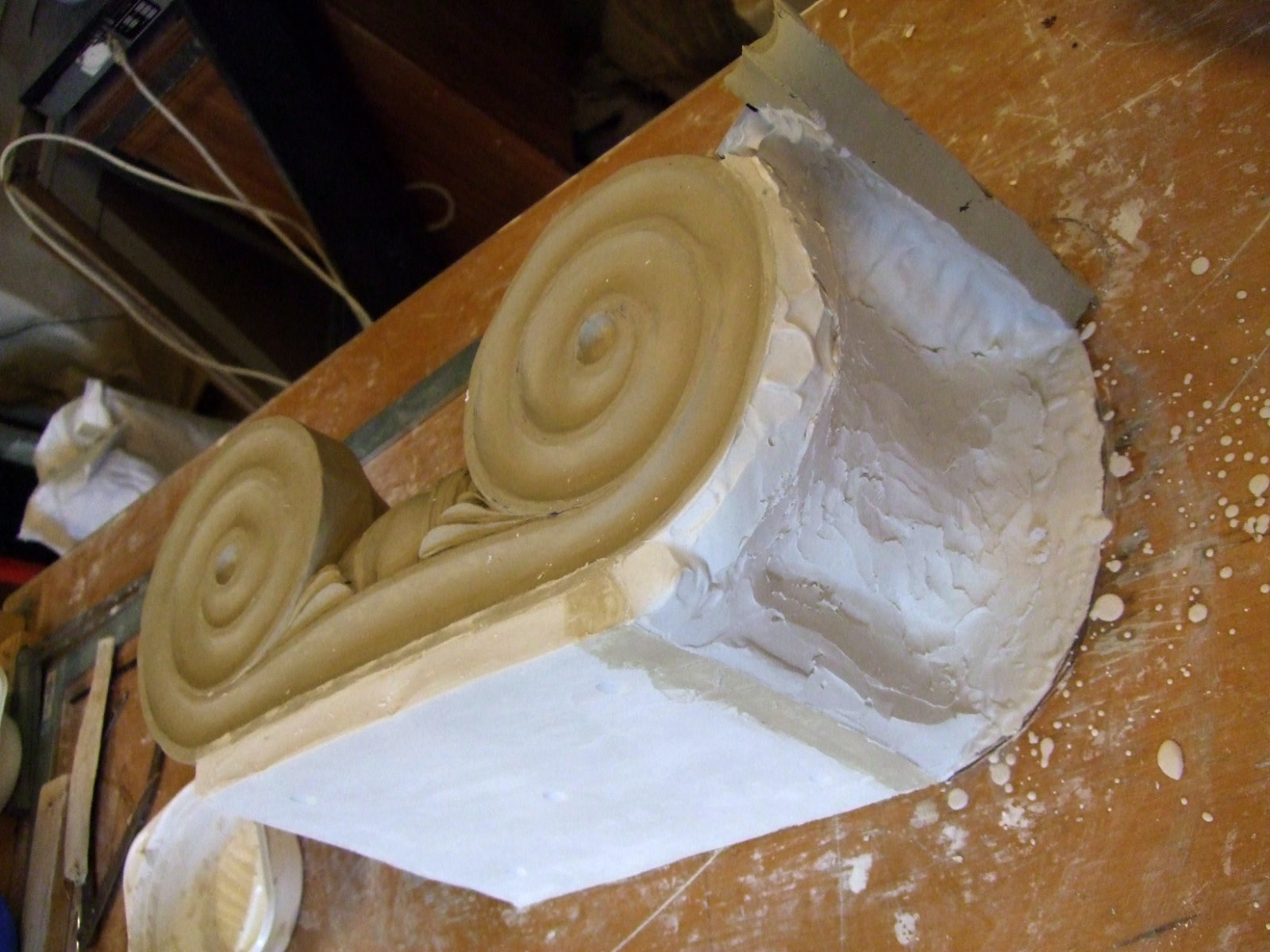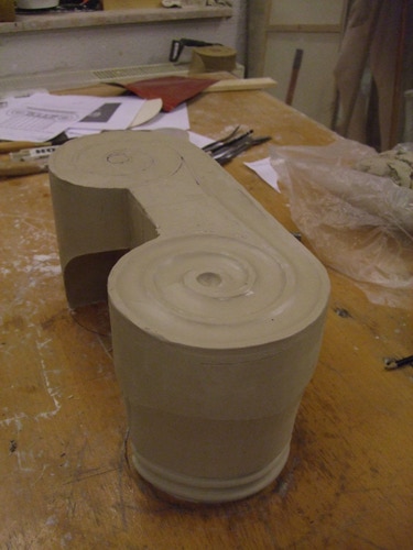 An mich herangetragen wurde die Frage und Bitte zwei Säulen zu fertigen. Sie sollten leicht sein und letztendlich aus zerbrochenen Elementen bestehen. Ich entschied mich für ionische Säulen und zeige erst einmal die Herstellung des Modells, hier des Kapitells, dann die Abformung und das daraus erstellte Positiv.