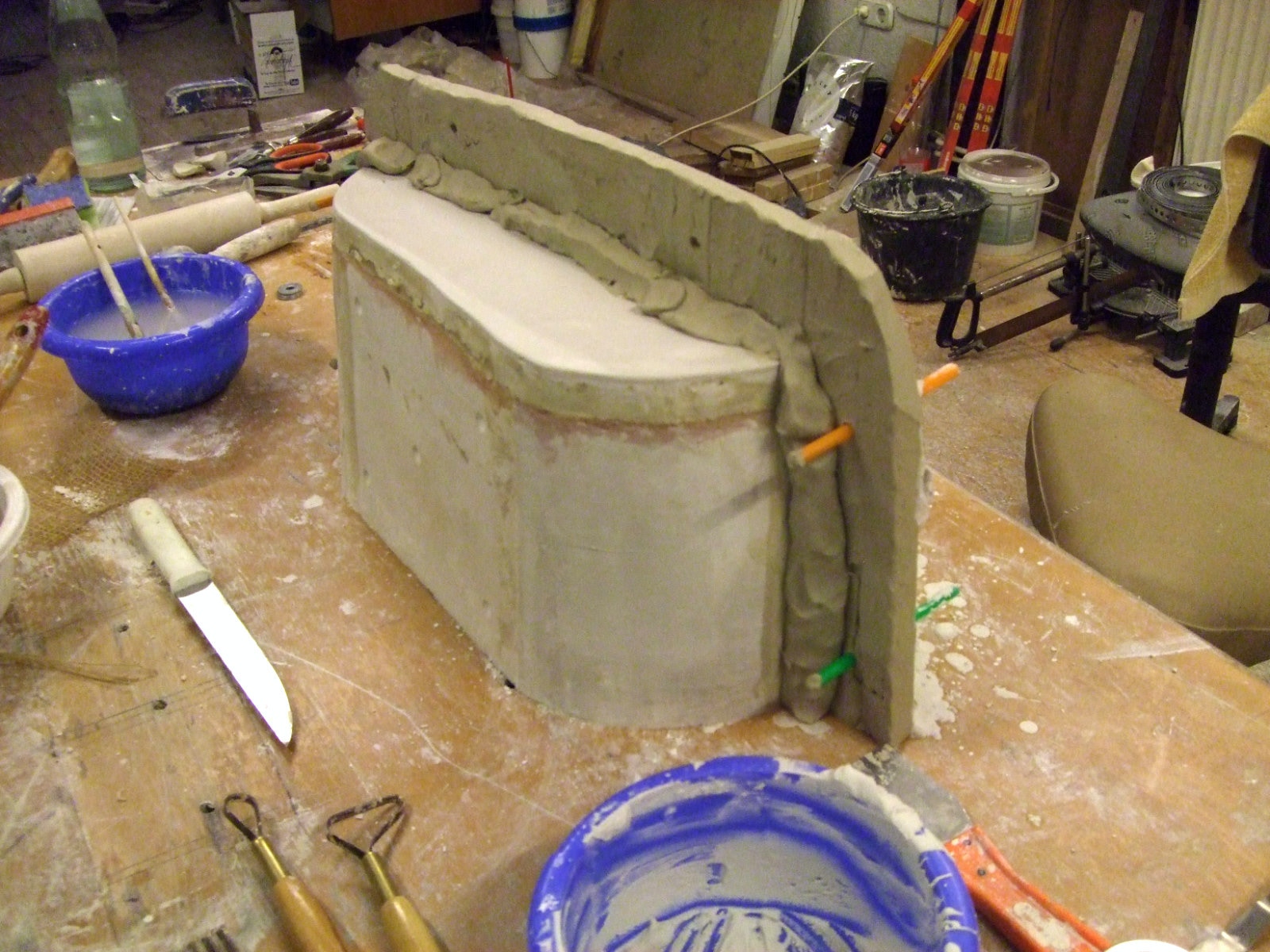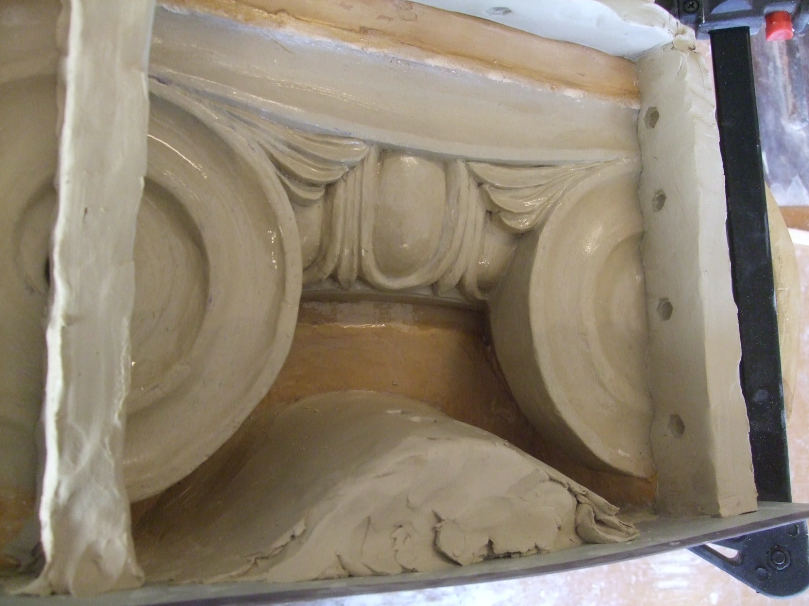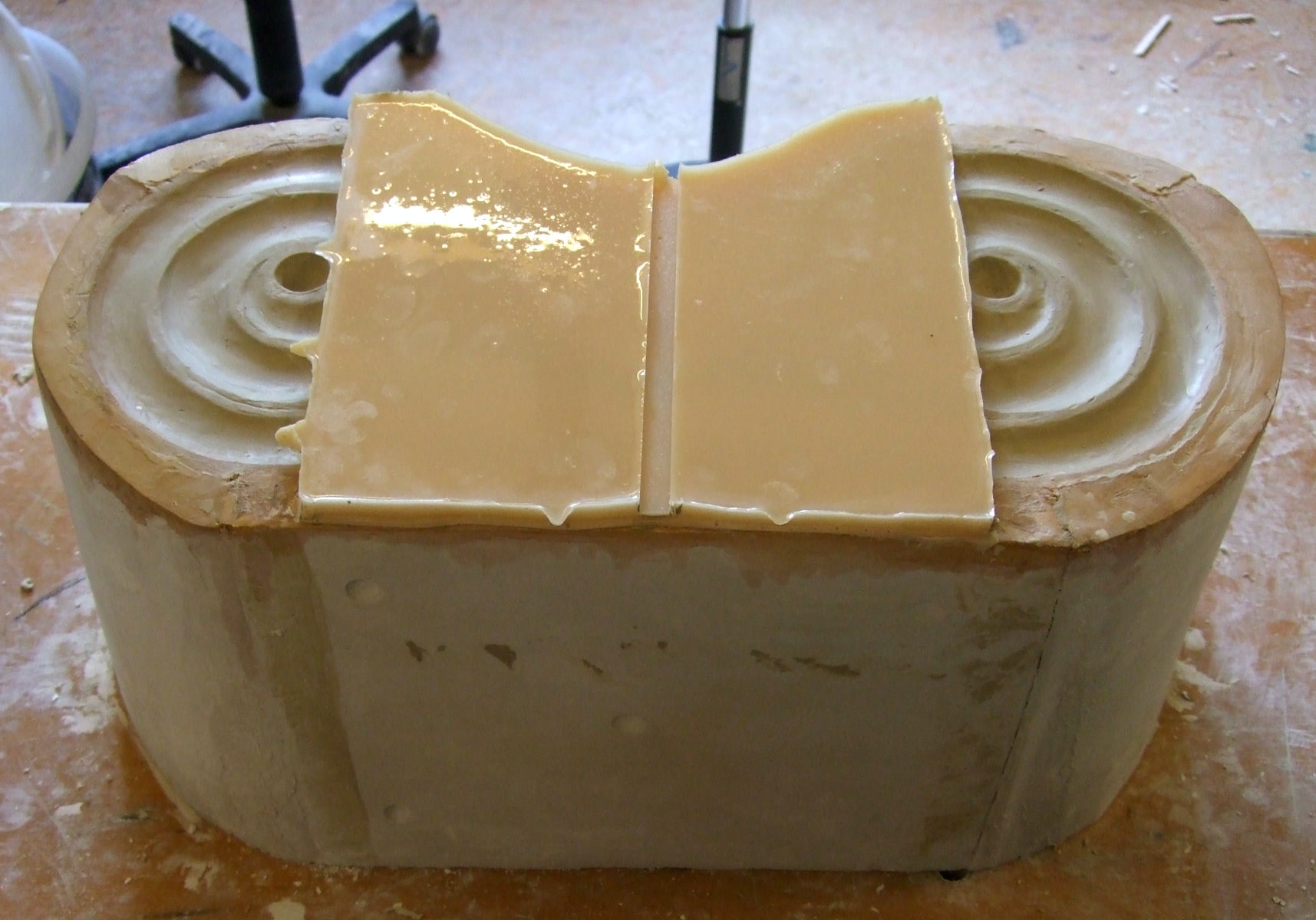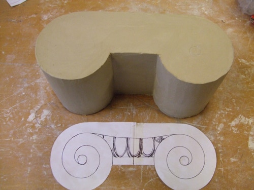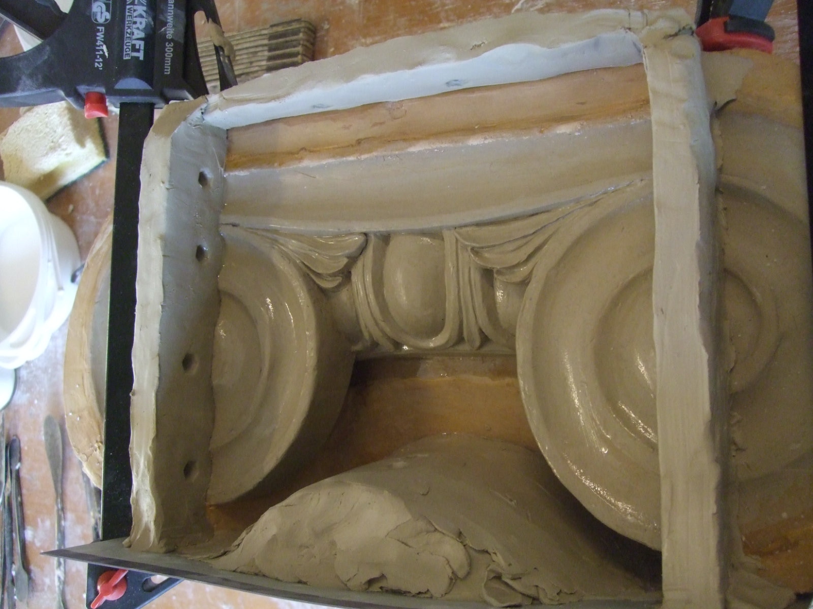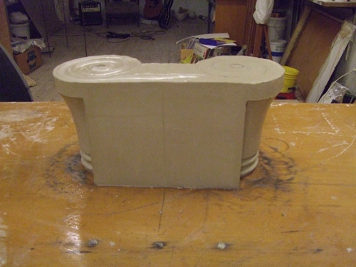 An mich herangetragen wurde die Frage und Bitte zwei Säulen zu fertigen. Sie sollten leicht sein und letztendlich aus zerbrochenen Elementen bestehen. Ich entschied mich für ionische Säulen und zeige erst einmal die Herstellung des Modells, hier des Kapitells, dann die Abformung und das daraus erstellte Positiv.