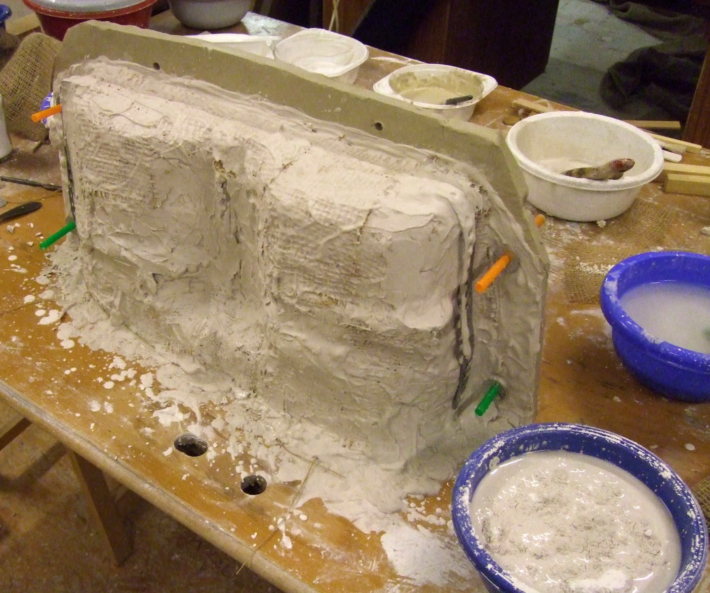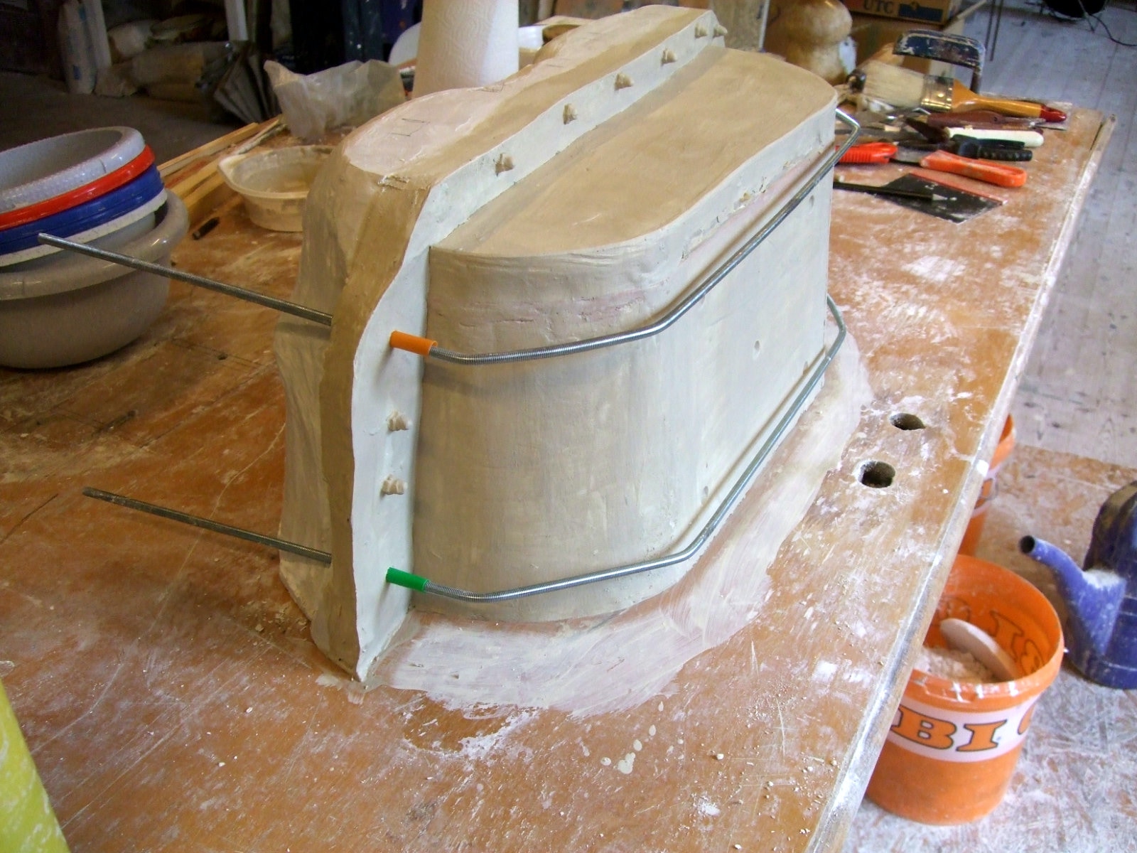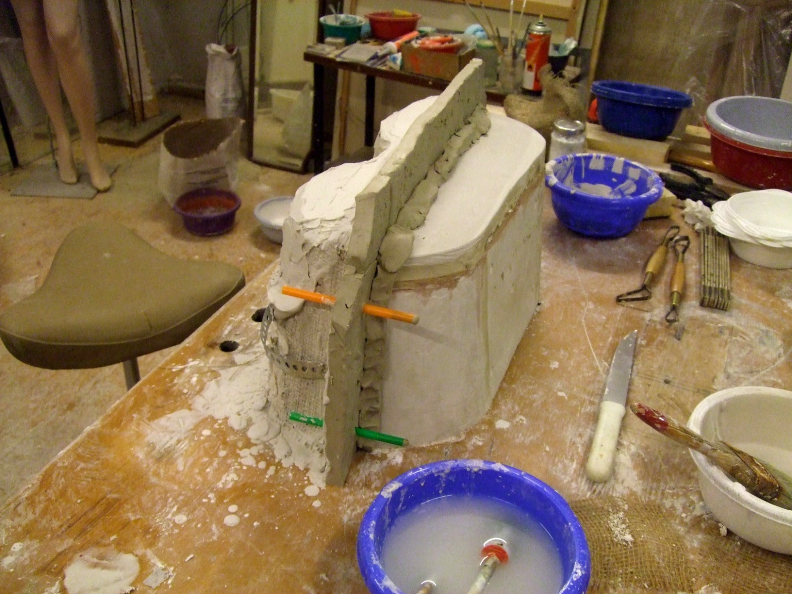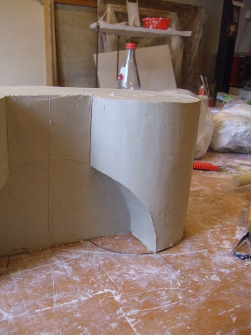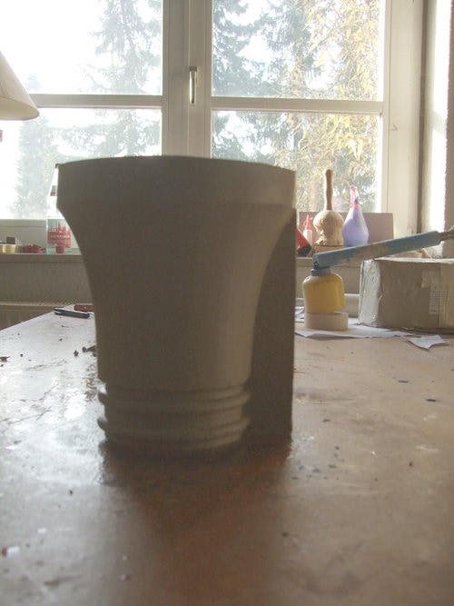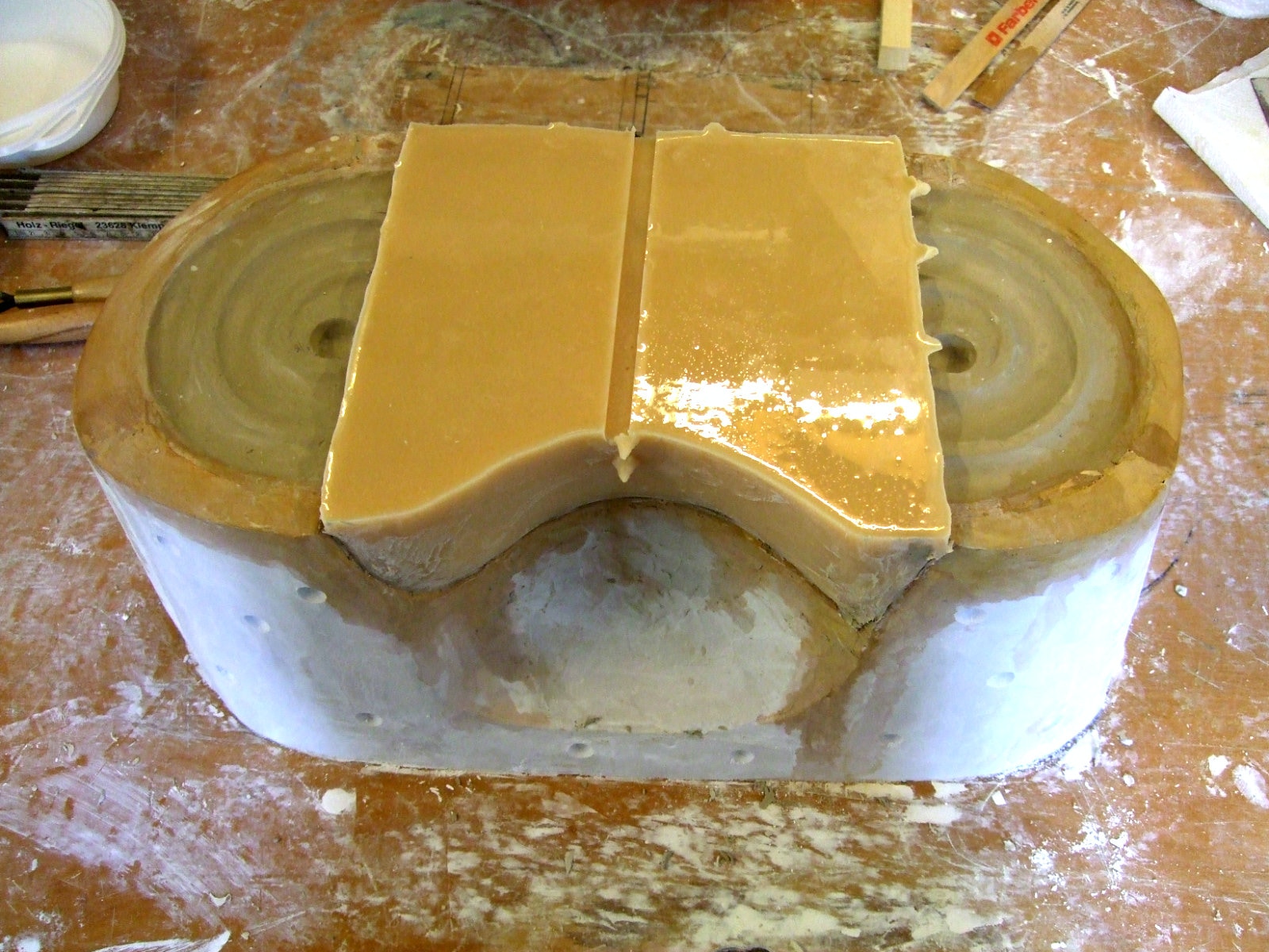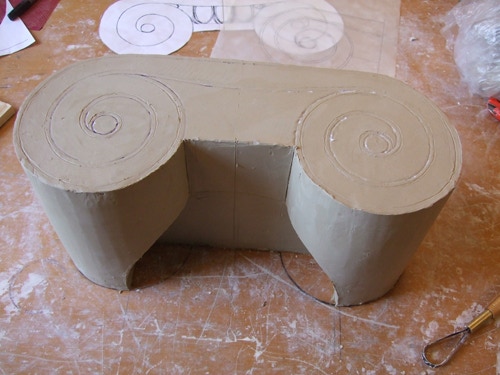 An mich herangetragen wurde die Frage und Bitte zwei Säulen zu fertigen. Sie sollten leicht sein und letztendlich aus zerbrochenen Elementen bestehen. Ich entschied mich für ionische Säulen und zeige erst einmal die Herstellung des Modells, hier des Kapitells, dann die Abformung und das daraus erstellte Positiv.